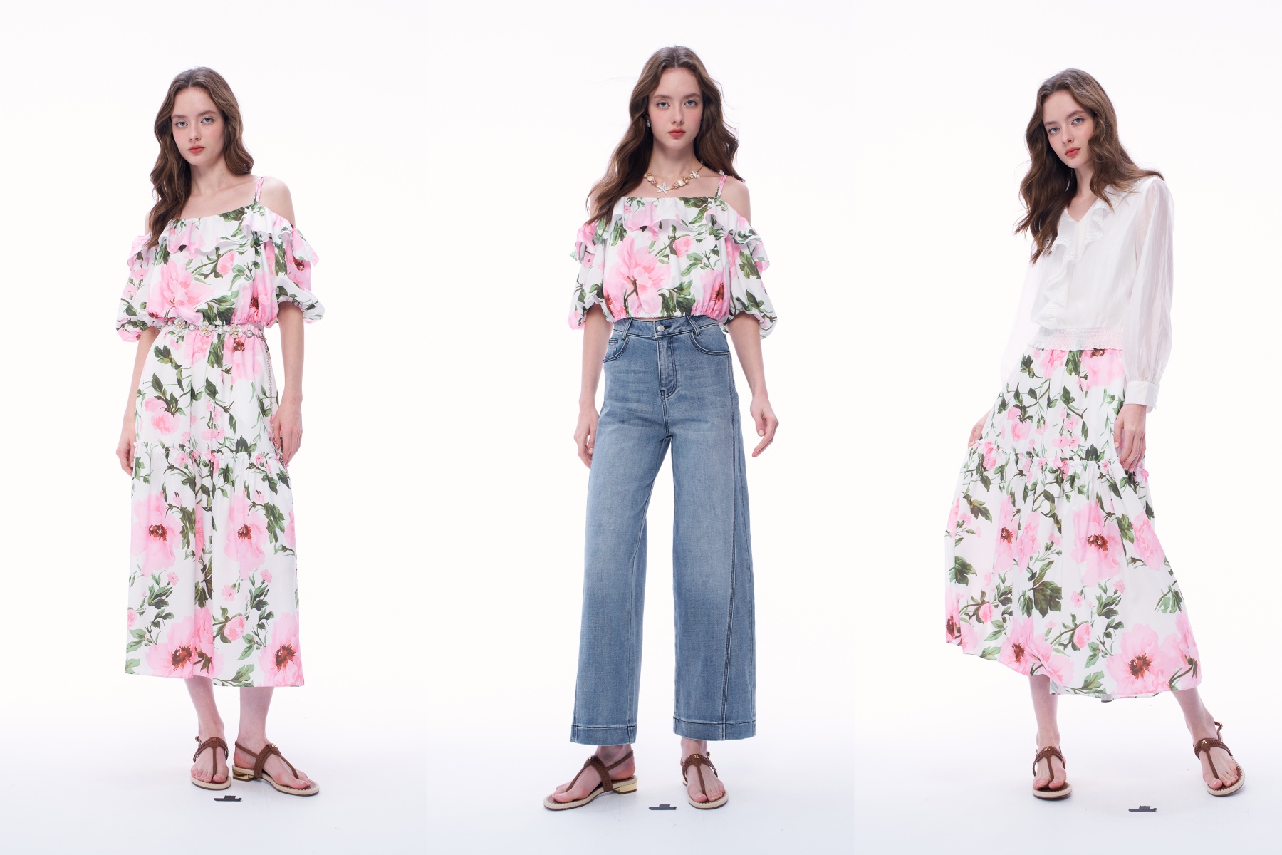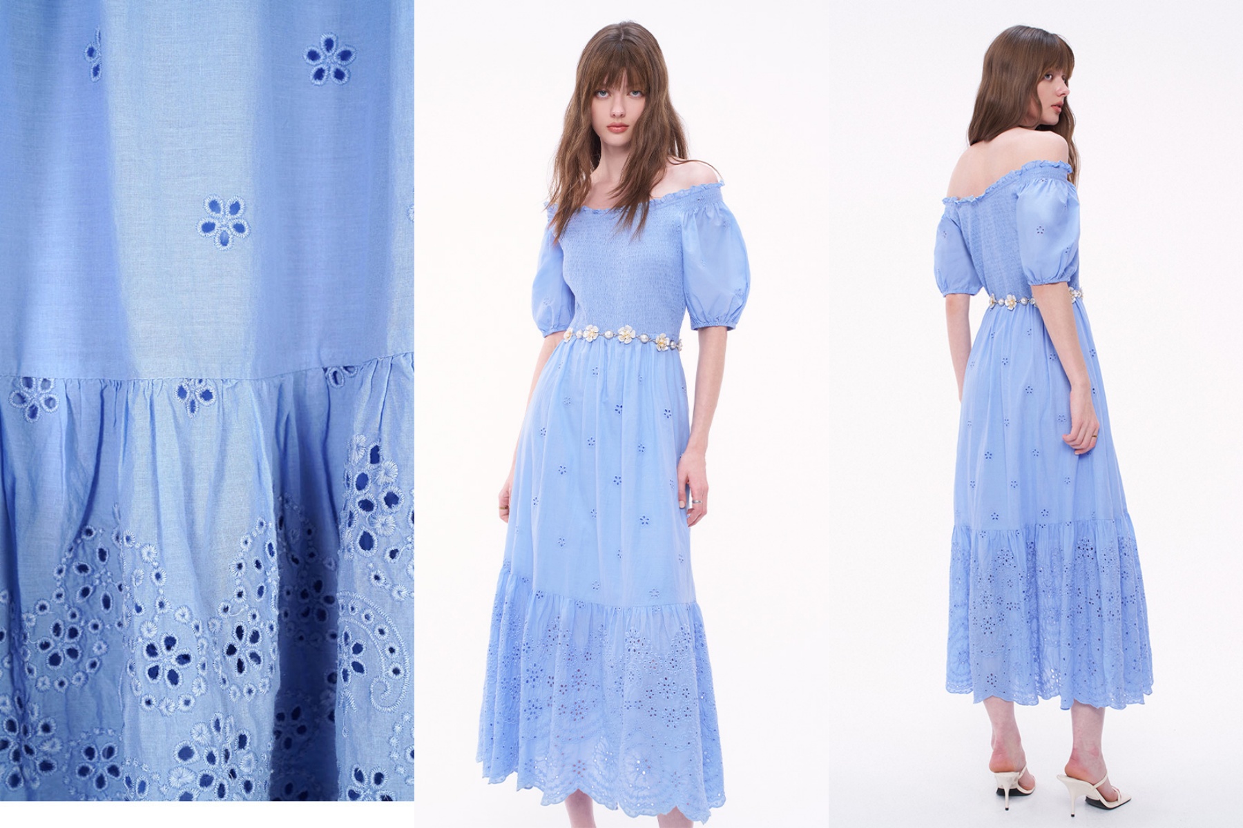 腰部搭配小花裝飾腰帶,彷彿雲朵間盛開的春花,不僅是視覺亮點,更在無形中拉高了腰線。搭配細帶奶油色高跟涼鞋,延伸腿部視覺,保持整體的清爽色調,輕鬆展現氣質柔和的穿搭感。