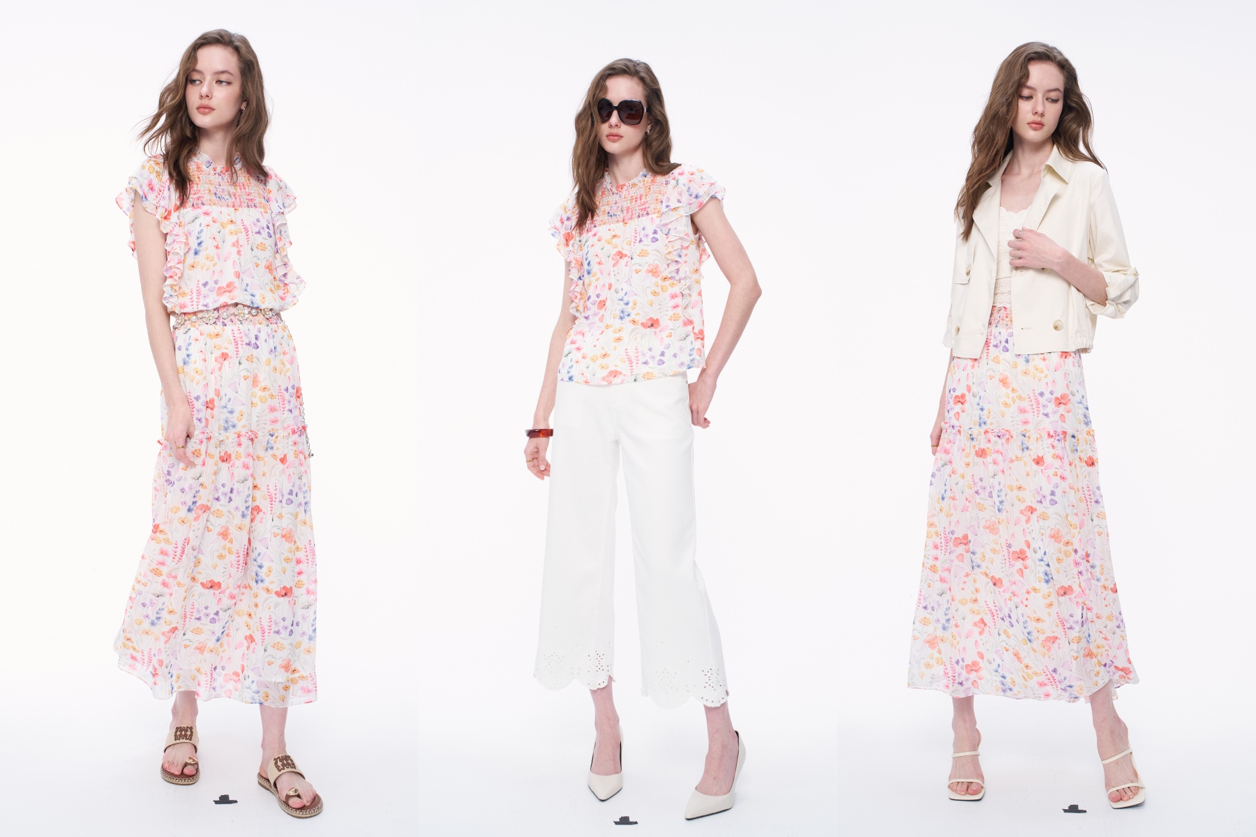 Look2風格上身是細節豐富的碎花荷葉邊上衣,下身則選擇純白乾淨的褲裝,既有女性的嬌俏,又展現出自在隨性的時髦度。