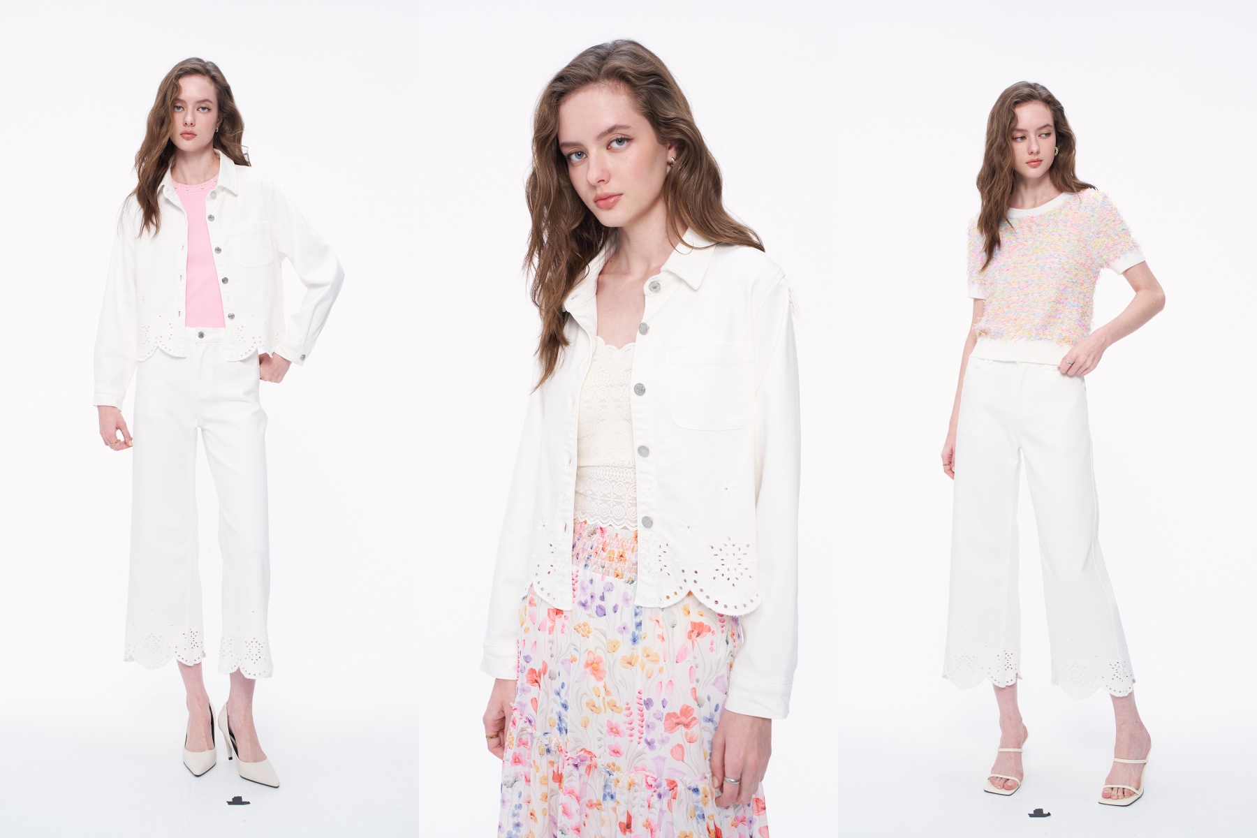 Look2將下身換成碎花長裙,並內搭蕾絲背心,白外套此刻化身為最精緻的陪襯。碎花元素增加了清新活力,外套下擺的鏤空設計與蕾絲內搭呼應,細節層次感最豐富。