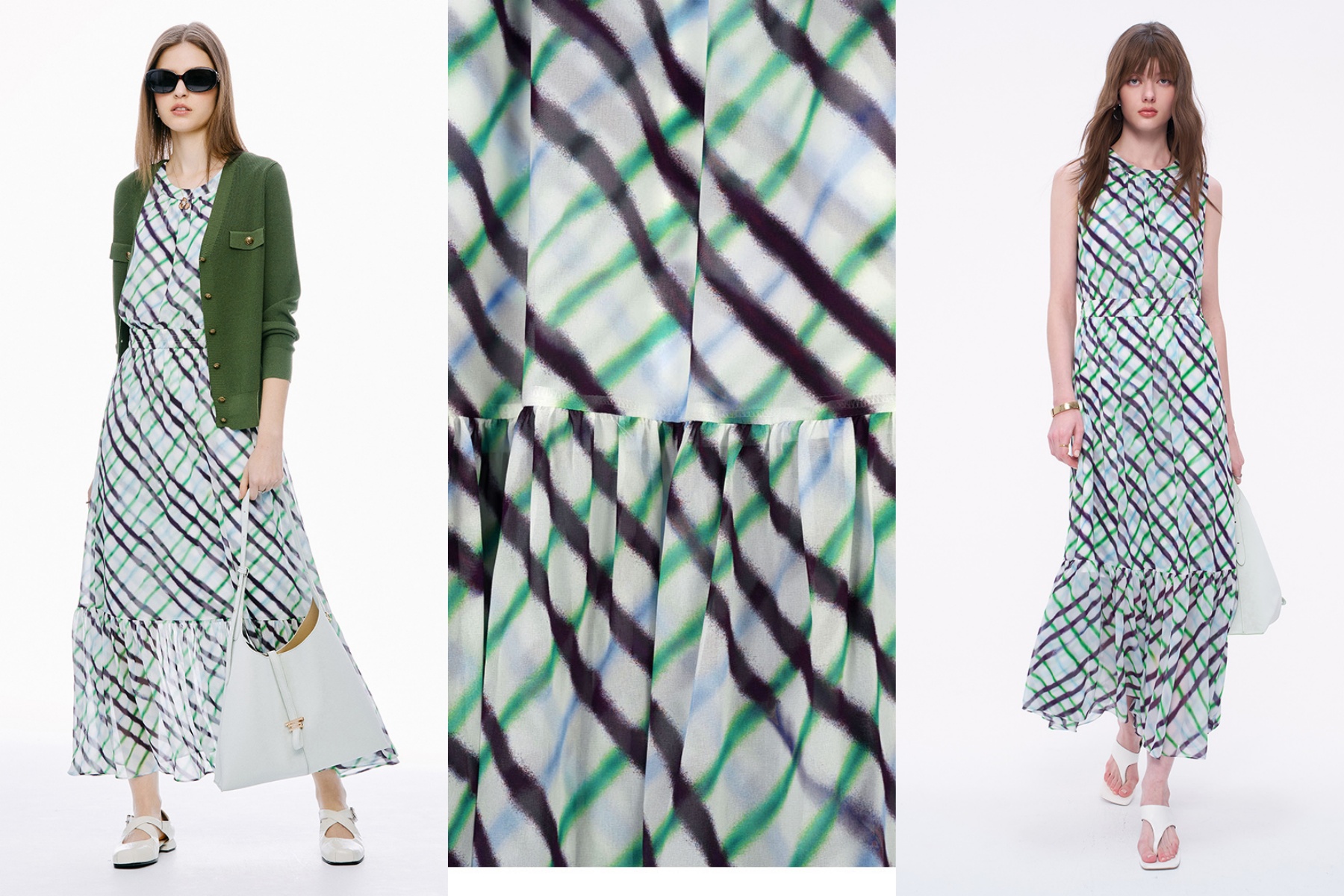 捨棄了生硬的線條,改以綠色與深紫色交織渲染。這款洋裝還搭配雙層雪紡的層次設計,有視覺交錯的呈現,不僅柔和還能修飾身型輪廓,在燈光下更具層次動感。