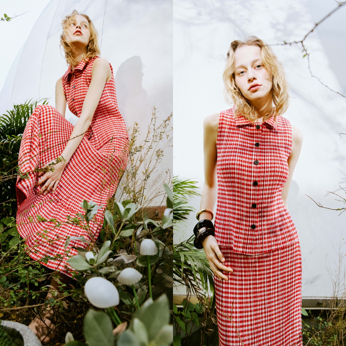 想將格紋穿出高級感,直接成套搭配就是最聰明的時髦捷徑。上身穿上復古紅格紋無袖壓褶背心,俐落翻領與前襟的黑色排釦巧妙揉合了都會率性俐落,獨特的立體壓褶面料不僅親膚舒適,更為視覺注入豐富層次。