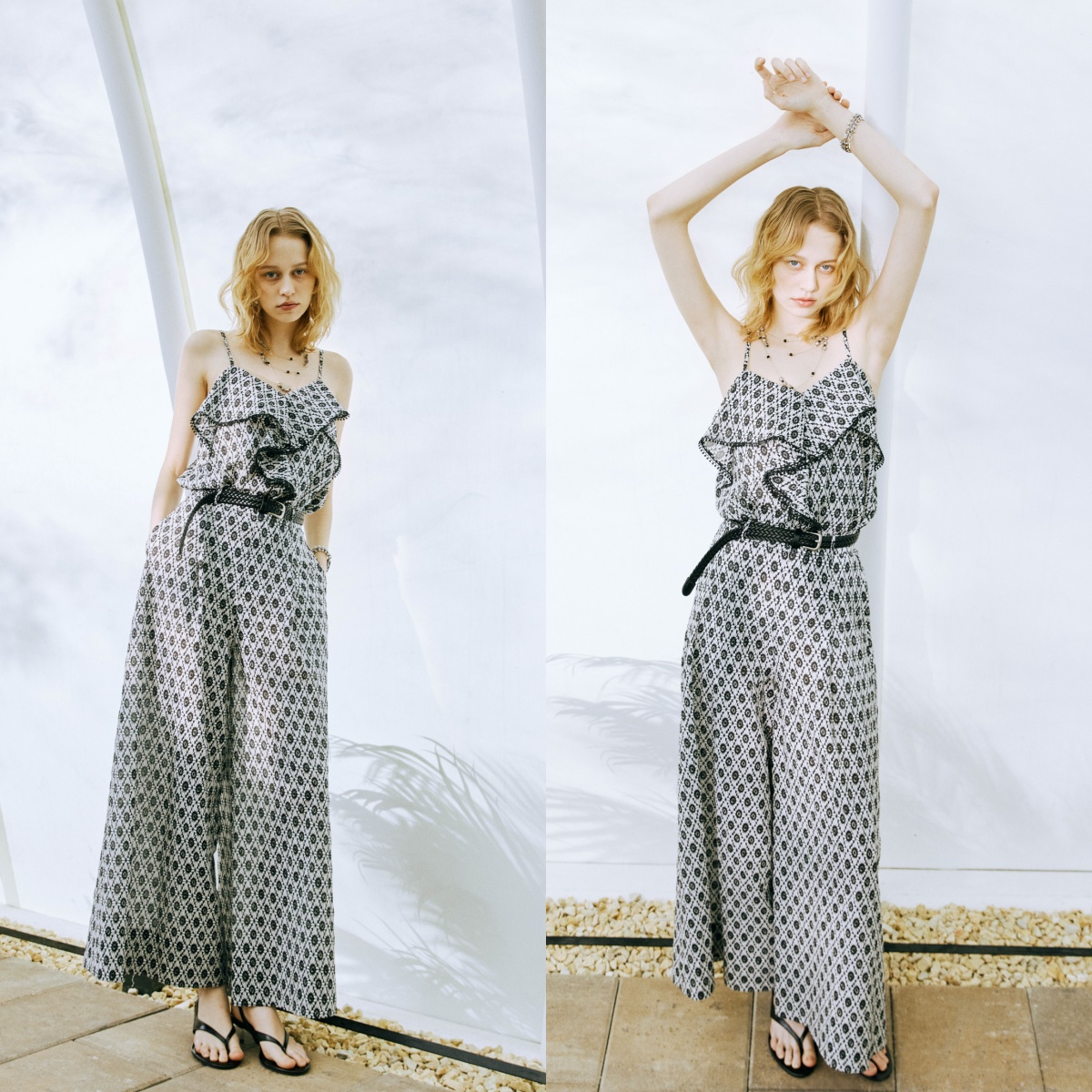 想詮釋這份隨性自在的法式鬆弛感,成套的圖騰穿搭依舊是最高級的解答:上身換上夏日幾何花影荷葉上衣,細肩帶與 V 領設計完美展現優雅女人味,前片的大荷葉邊拼接點綴著精緻的球球蕾絲,在黑白視覺中堆疊出浪漫的立體層次。