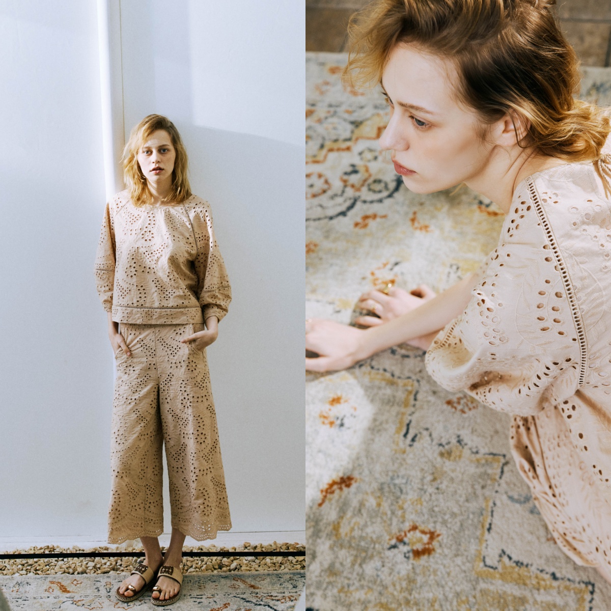 捕捉夏日裡最迷人的光影魔法!這套淺卡其刺繡棉套裝,彷彿汲取了藝術感牆面與異國風情地毯的視覺靈感,點綴著迷人的幾何雕花細節 ,將自然工藝概念完美融入服裝之中。有別於高彩度的搶眼,這抹溫潤內斂的「暖陽沙色」搭配滿版細緻的鏤空雕花,宛如將海島假期的慵懶午後輕輕披在身上,散發著迷人的波西米亞風情。