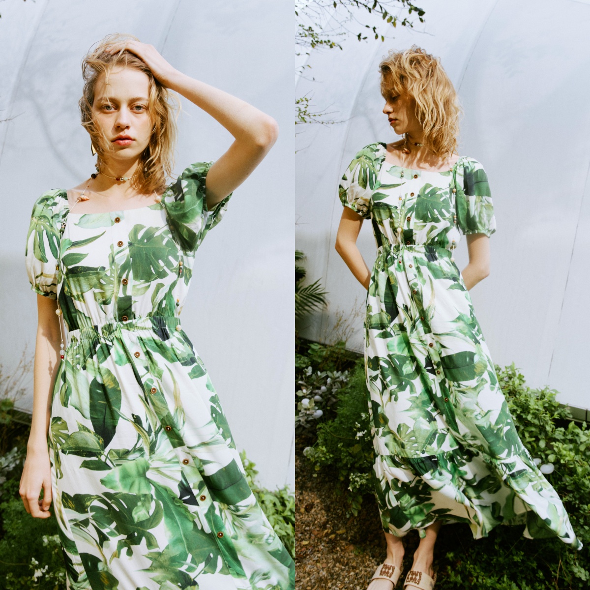 將熱帶島嶼的生機盎然,化作夏日裡最亮眼的一抹清新。這件單品以大面積的「熱帶綠葉印花」為視覺主調,彷彿將微風中輕輕搖曳的芭蕉葉生動捕捉。充滿活力的綠意交織,不僅替高溫氣候注入滿滿的熱帶風情,更讓妳無論身處都市或海島,都能自帶一股愜意的視覺涼感。