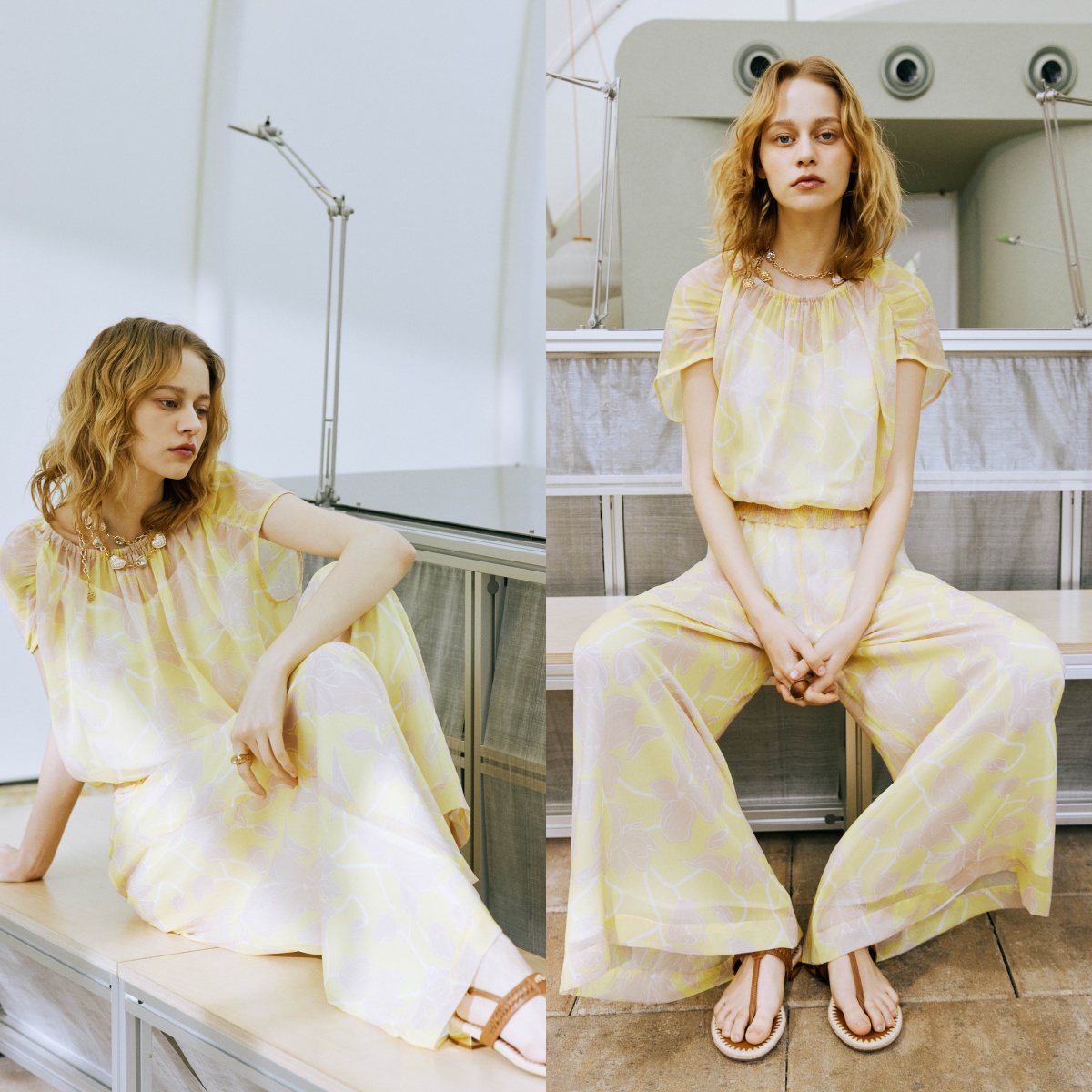 下身搭配同款盛夏柔黃印花雪紡修身寬褲,腰部整圈彈性鬆緊帶帶來舒適不勒肚的零負擔體驗。垂墜感極佳的寬褲版型隨著步伐搖曳生姿,不僅能巧妙藏肉,更能輕鬆拉長腿部比例。腳踏一雙質感的羊皮涼拖鞋,便能以最輕盈舒心的姿態,完美駕馭從城市漫步到海島度假的各種夏日場合。