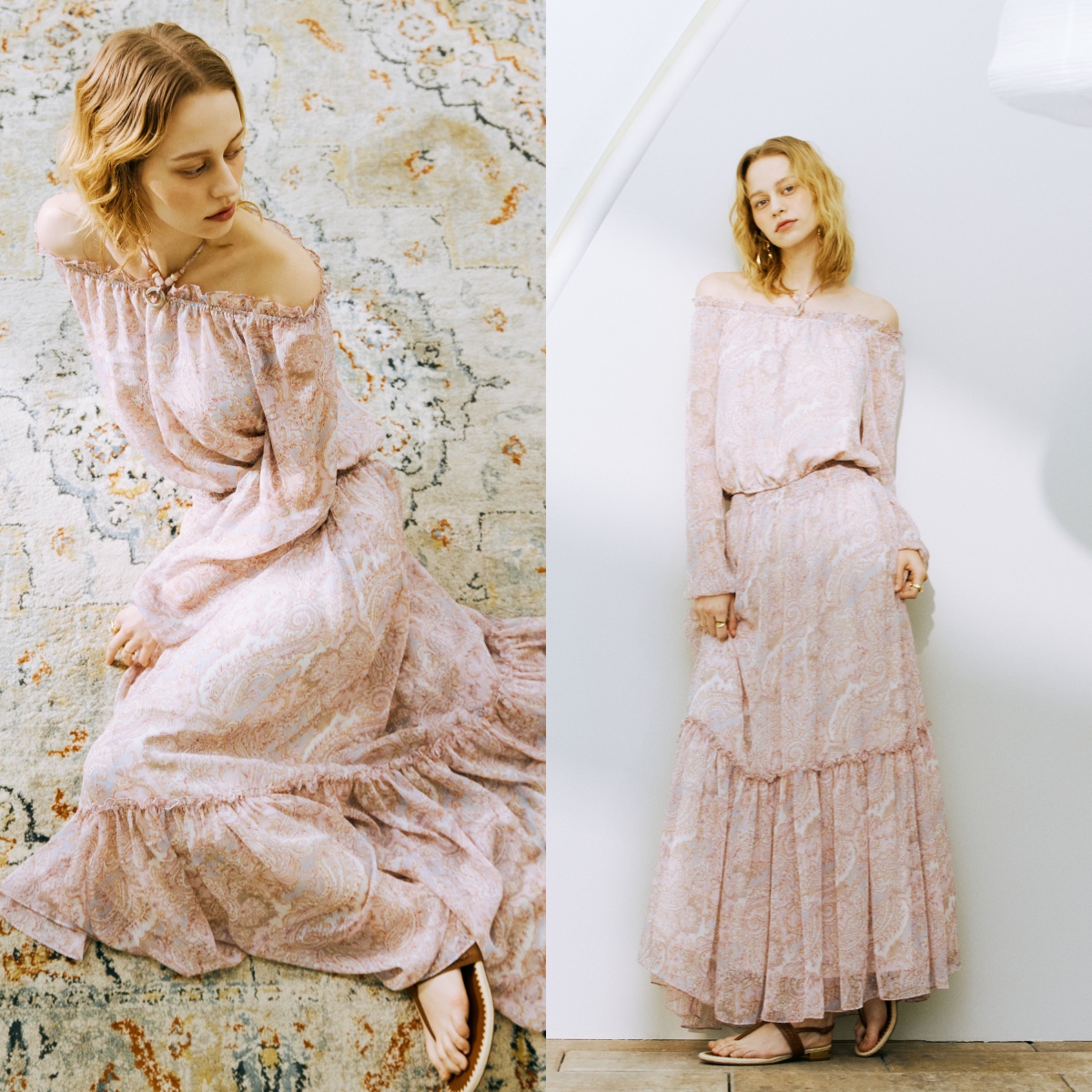 以波西米亞印花勾勒出夏季日常的浪漫輪廓,利用面料的輕盈感與色彩的光影交織,速寫出更加放鬆自在的時髦姿態。彷彿將清晨的一抹微霧披在身上,在盛夏艷陽下,這組「柔美霧感花語」系列巧妙替炎炎夏日帶來一抹輕盈縹緲的視覺清涼感。
