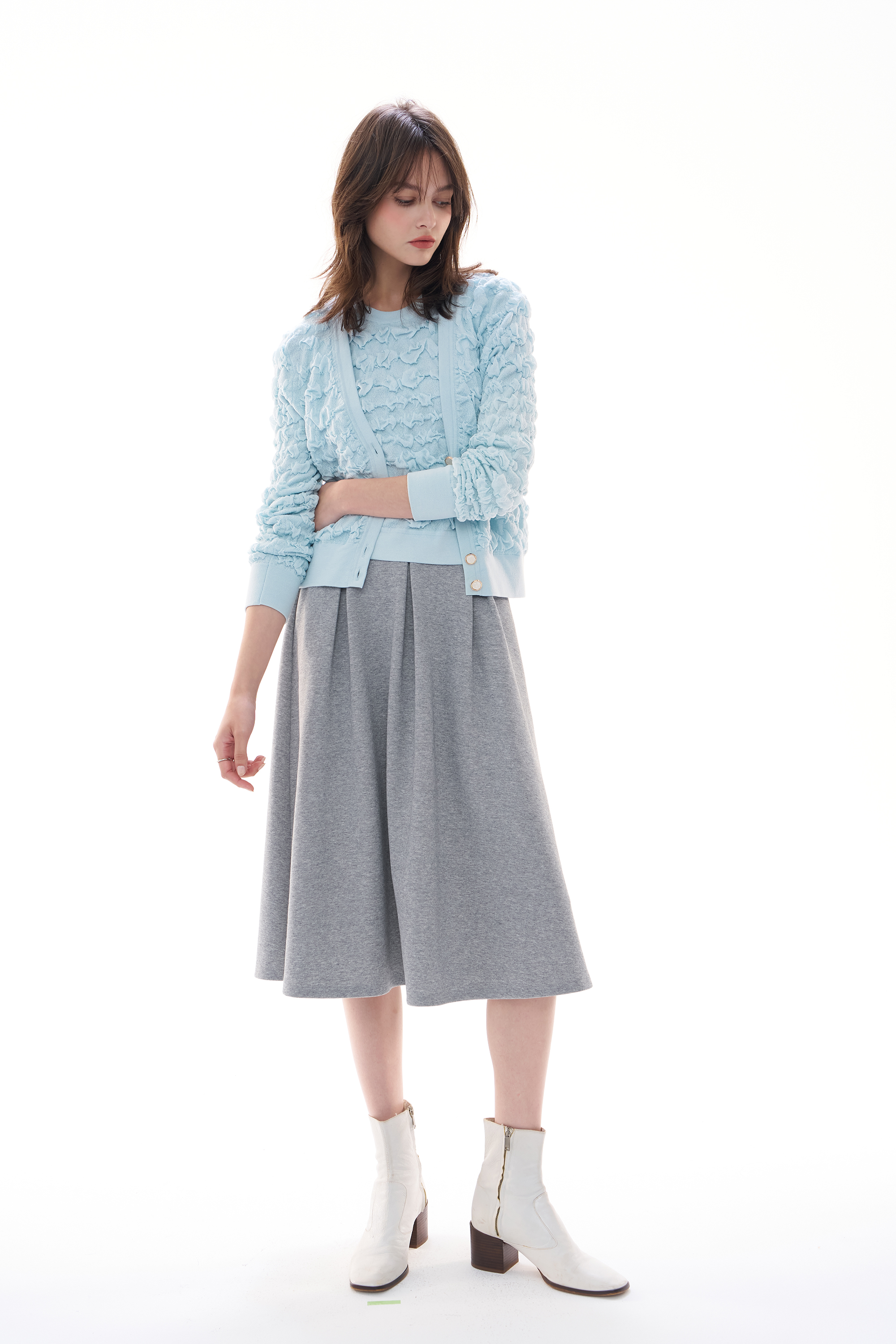 下身搭配知性優雅的打褶圓裙,裙擺隨著步伐輕輕飄動,剪裁精緻的打褶設計帶來獨特的立體感。