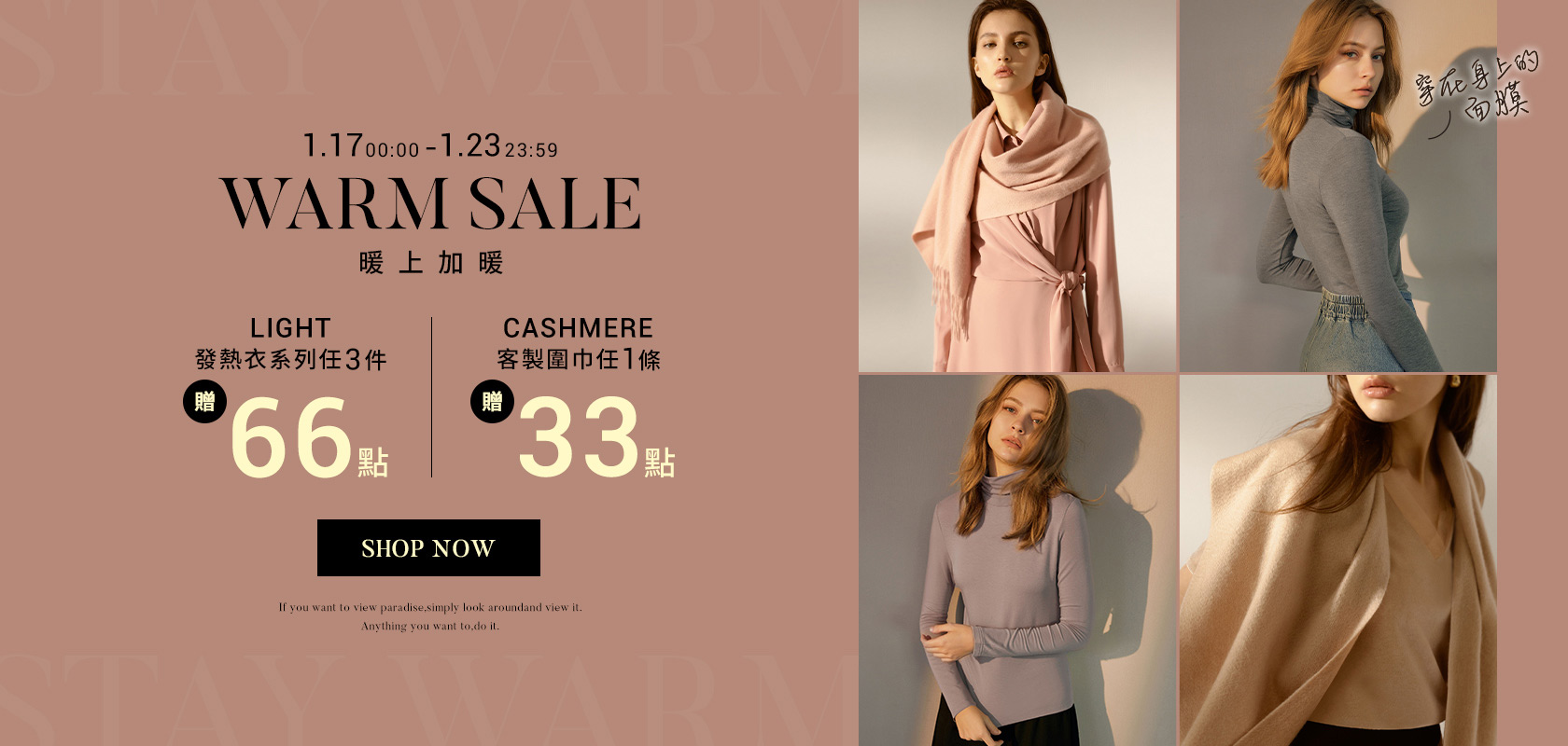 活動時間 : 2022/1/17 00:00~ 2022/1/23 23:59 活動辦法 : 1. 活動期間,單筆訂單含Light膠原蛋白水潤上衣系列任3件,加贈會員點數66點。 2. 活動期間,單筆訂單含官網限定Cashmere客製圍巾任1件,加贈會員點數33點。 * 注意事項:
