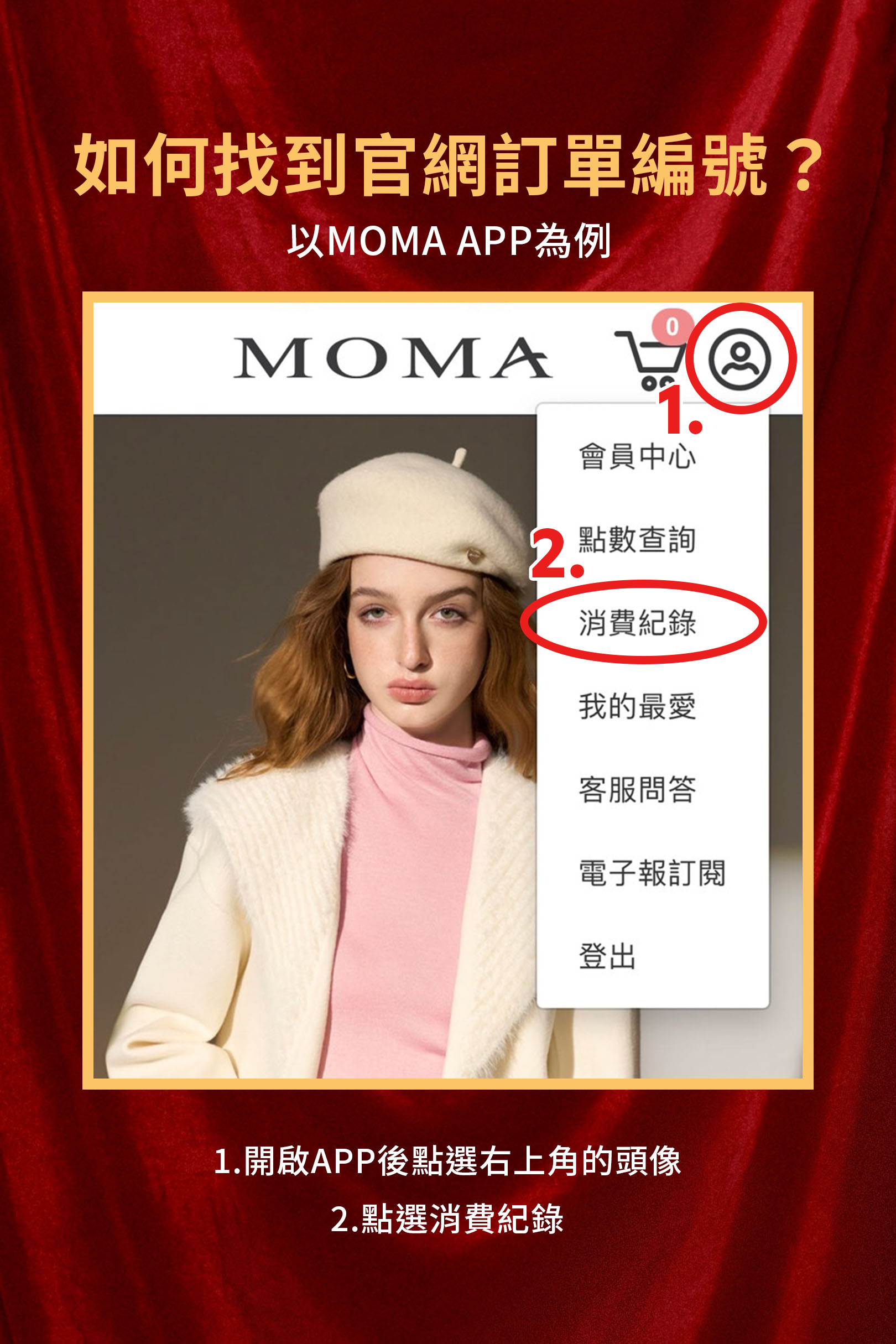 1. 追蹤 MOMA FB粉絲專頁、MOMA官方IG帳號 2. 2024/12/31 - 2025/01/02於MOMA官網消費,並於IG/FB活動貼文下方留言,「Happy New Year! 我的訂單編號是 : CC100000000000 」即可參加抽獎。