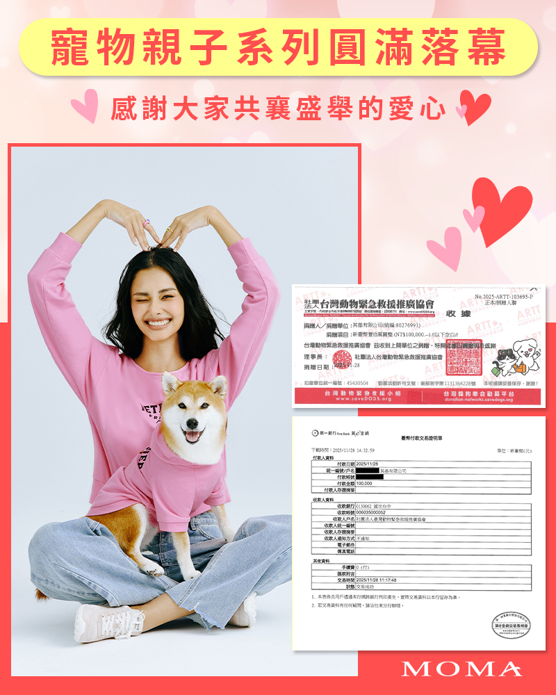 活動時間 : 10/14 00:00 ~ 10/31 23:59 活動方式 : 官網/門市購買<寵物親子>系列商品(商品賣場需註明為"寵物親子系列"商品) 將參與買一件捐$100、買兩件捐$200、買五件捐$500,以此類推,無件數上限。