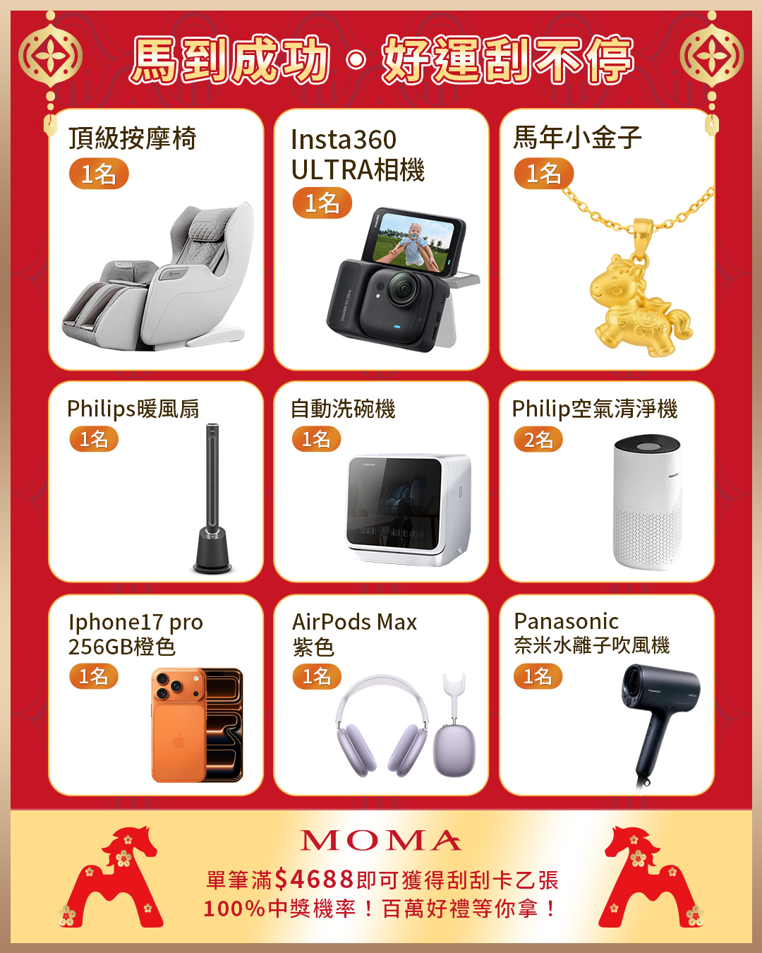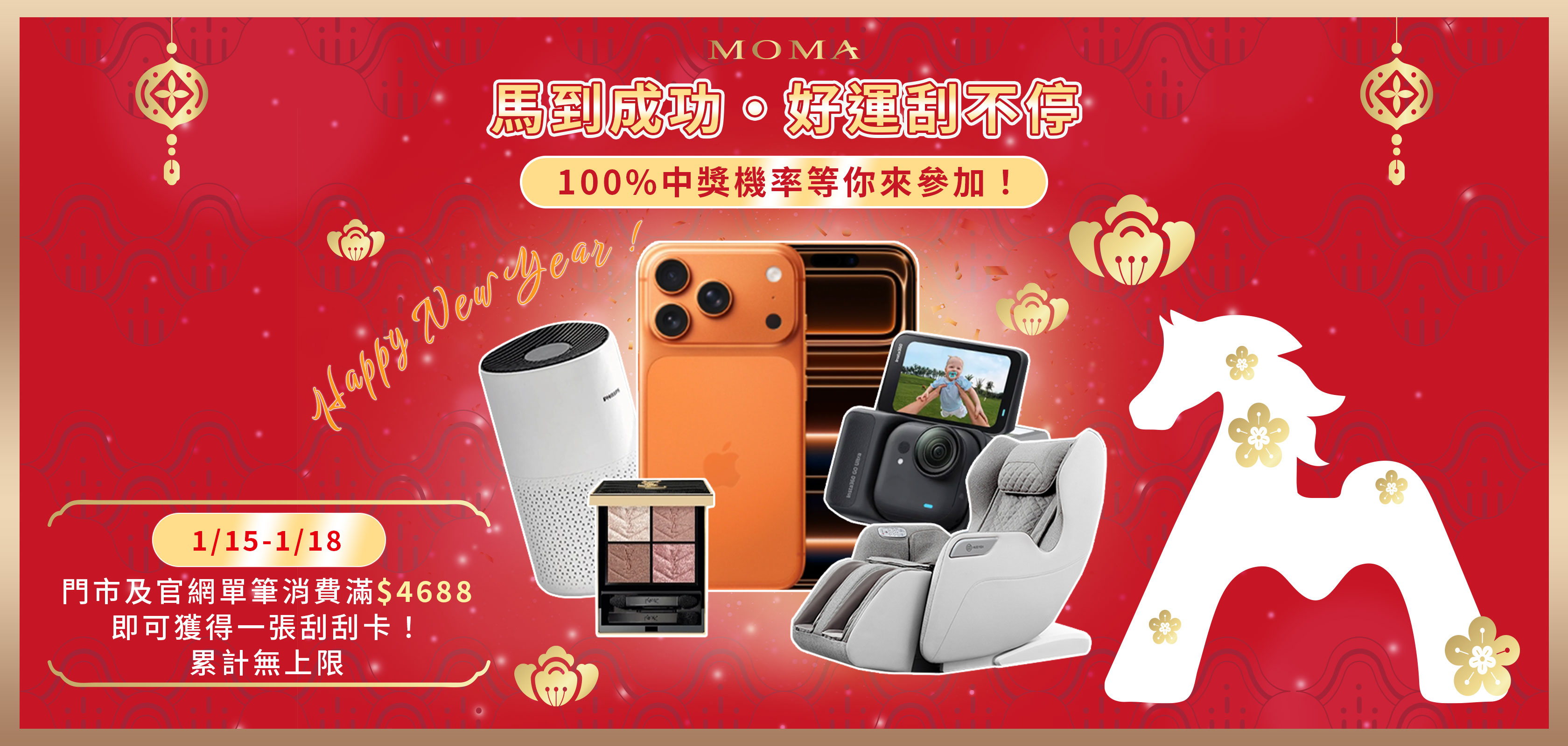 活動期間 (2026/01/15~2026/01/18) 於MOMA官方網站或門市單筆訂單消費滿 NT4,688,即可參加抽獎!