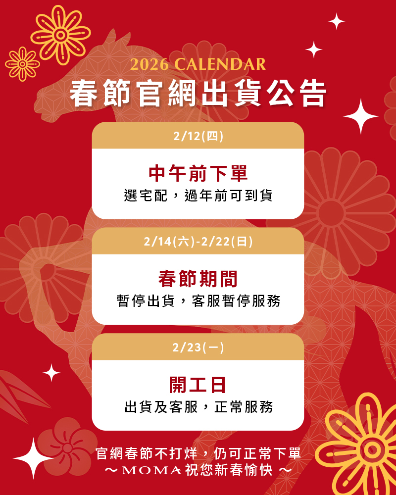 !官網春節期間不打烊,仍可正常瀏覽與下單,訂單將於開工後依序安排出貨!
