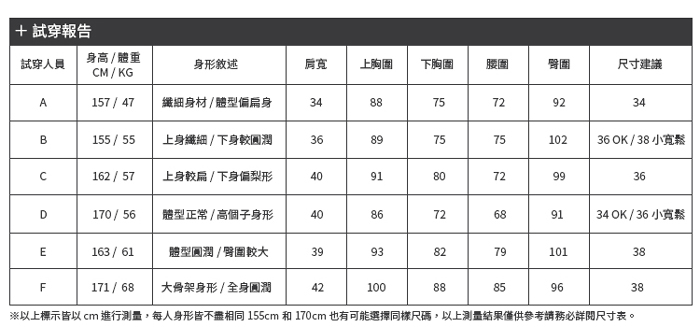 | 臀圍 | 86.4 cm | 91.4 cm | 96.5 cm | 101.6 cm | 34" | 36" | 38" | 40" |