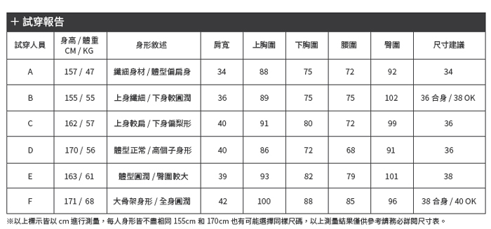 | 臀圍 | 86.4 cm | 91.4 cm | 96.5 cm | 100.3 cm | 104.1 cm | 34" | 36" | 38" | 39 1⁄2" | 41" |