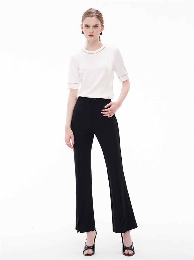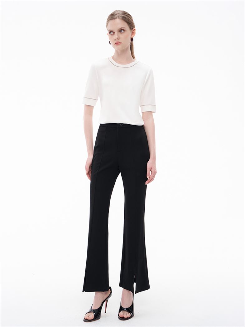 - 前片褲管直縫線與前中開衩造型,延伸腿長
