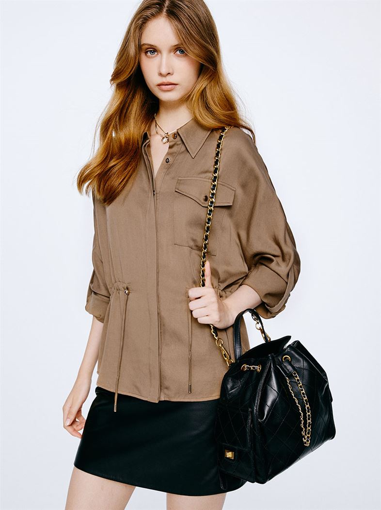 推薦穿搭 M+ | 絲綢光澤輕透銅氨纖維抽繩暗門襟襯衫 請點我