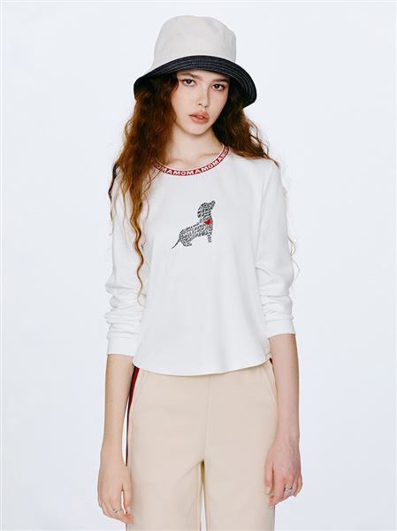 推薦同款芥黃色穿搭 時尚字母臘腸狗狗牙刷繡太空棉上衣-芥黃 請點我