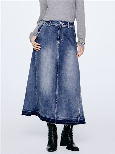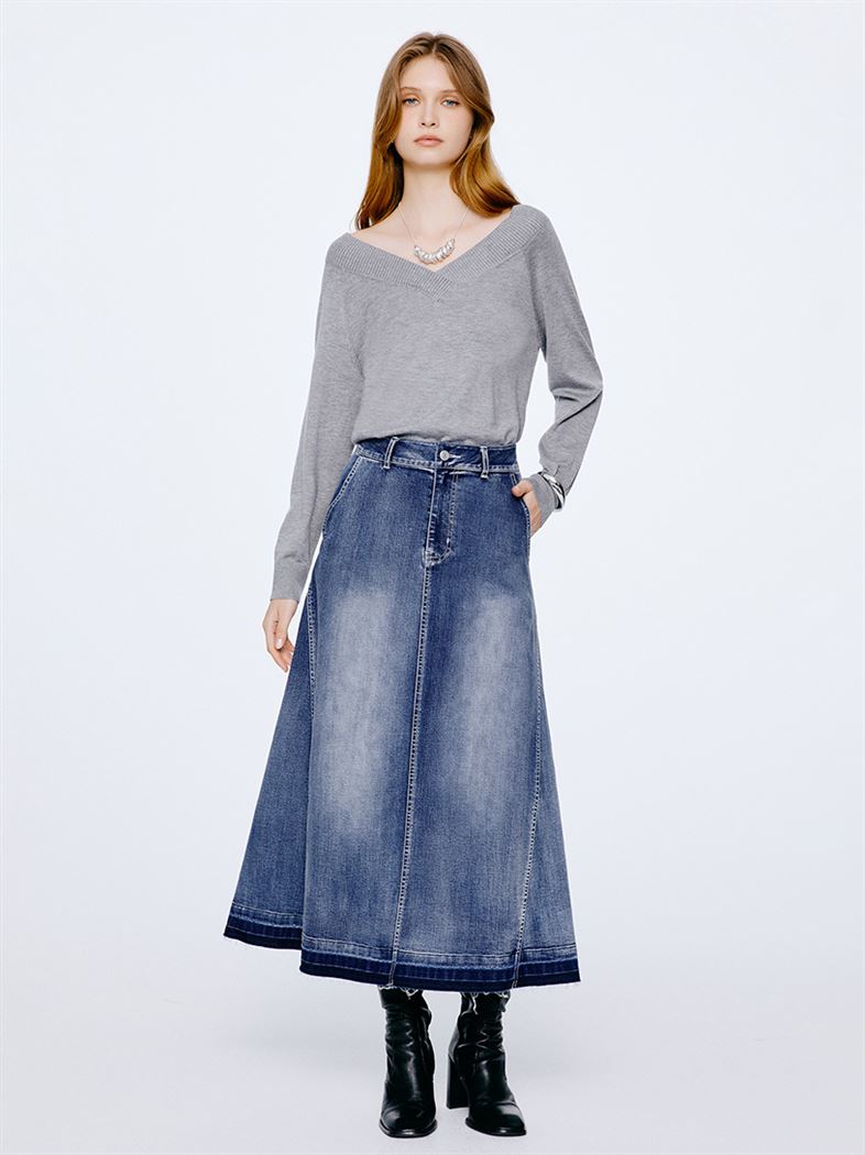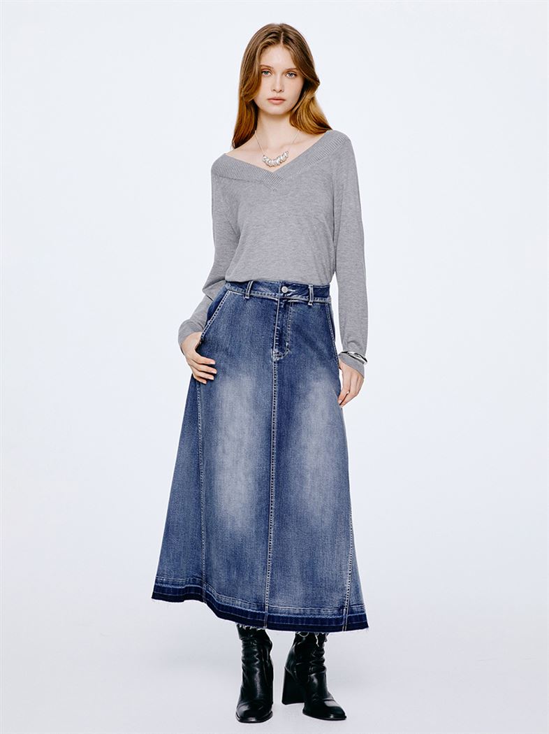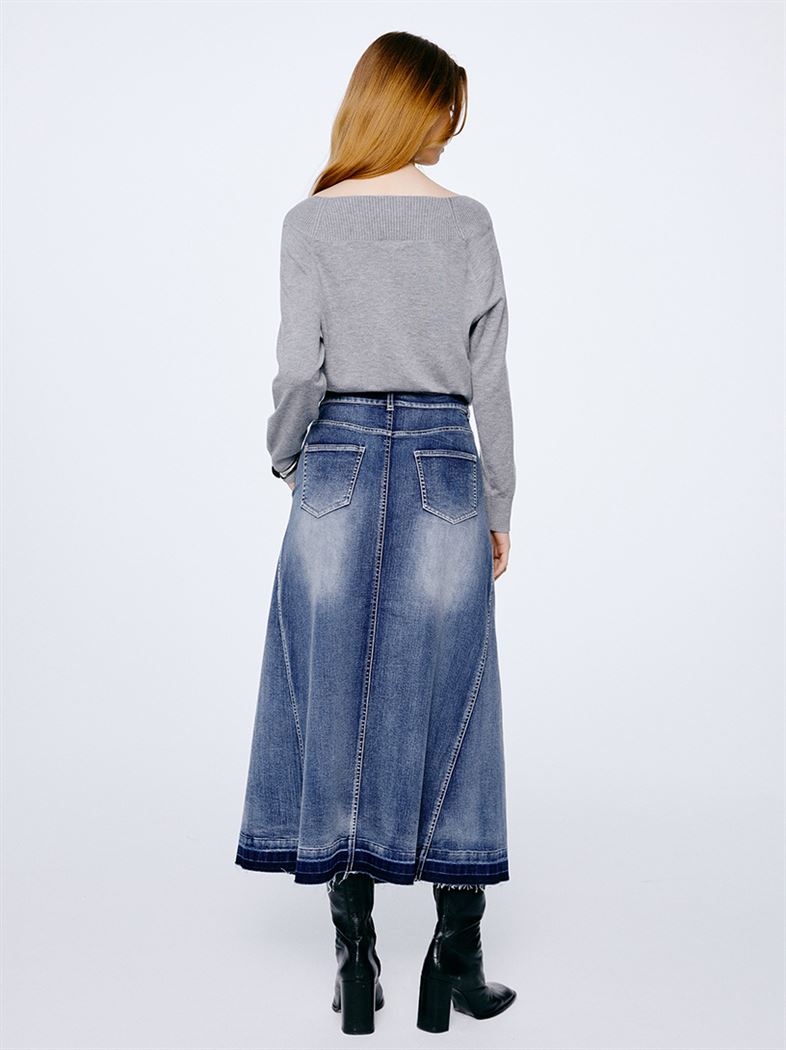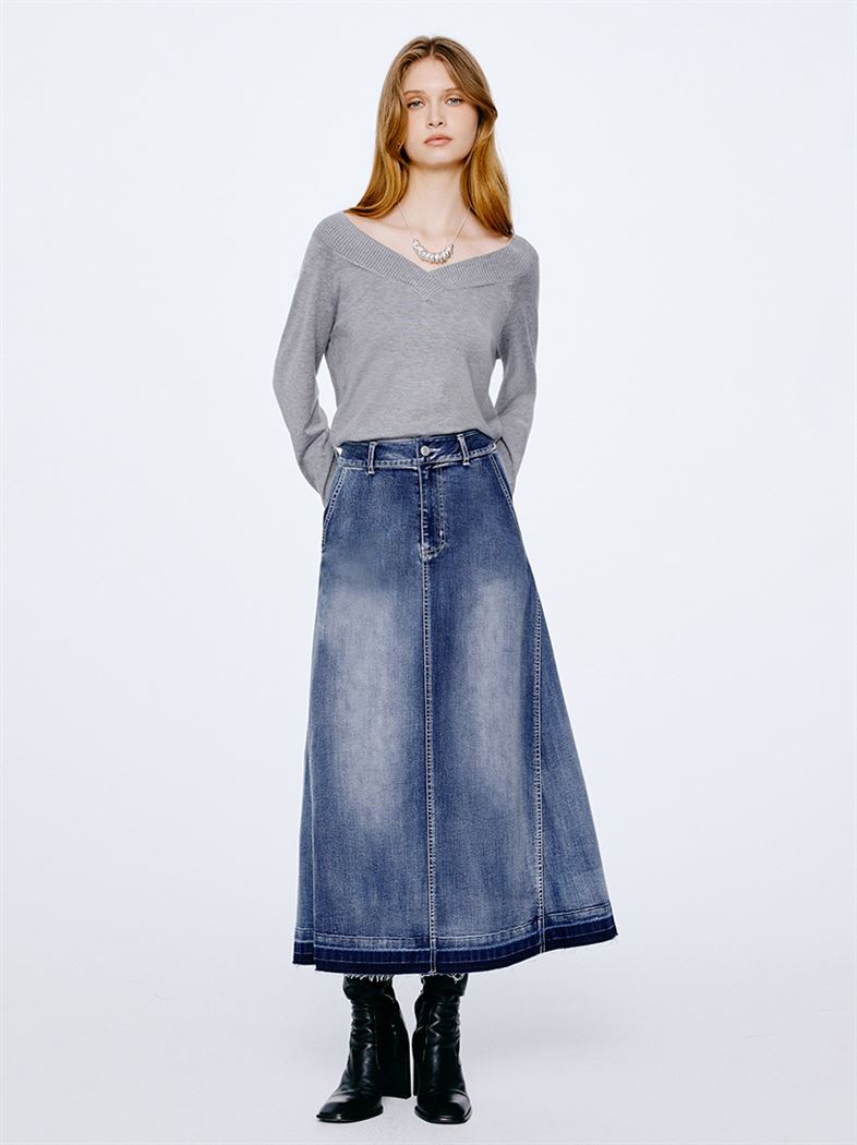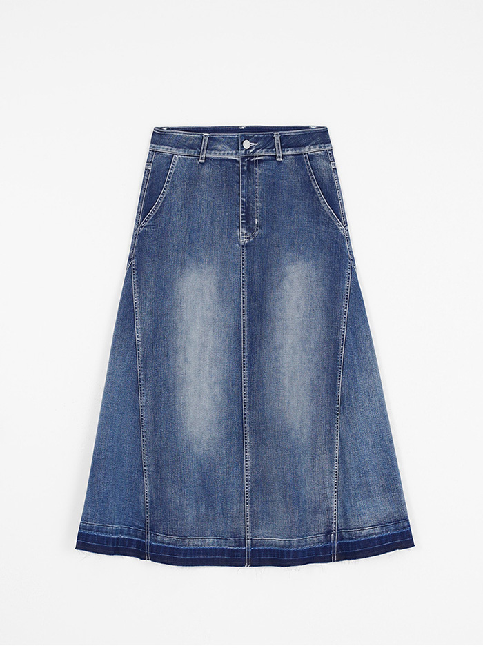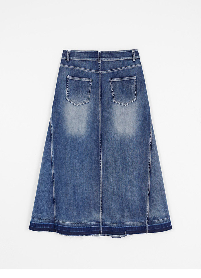 潮人態度刷色毛邊抽鬚A字牛仔長裙