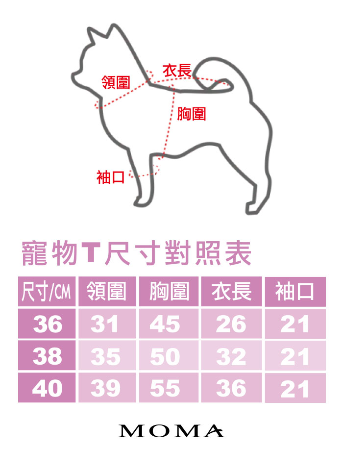 | 衣長 | 26 cm | 31.8 cm | 36.2 cm | 10 1⁄4" | 12 1⁄2" | 14 1⁄4" |