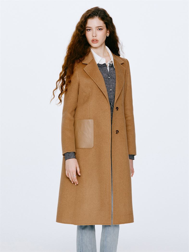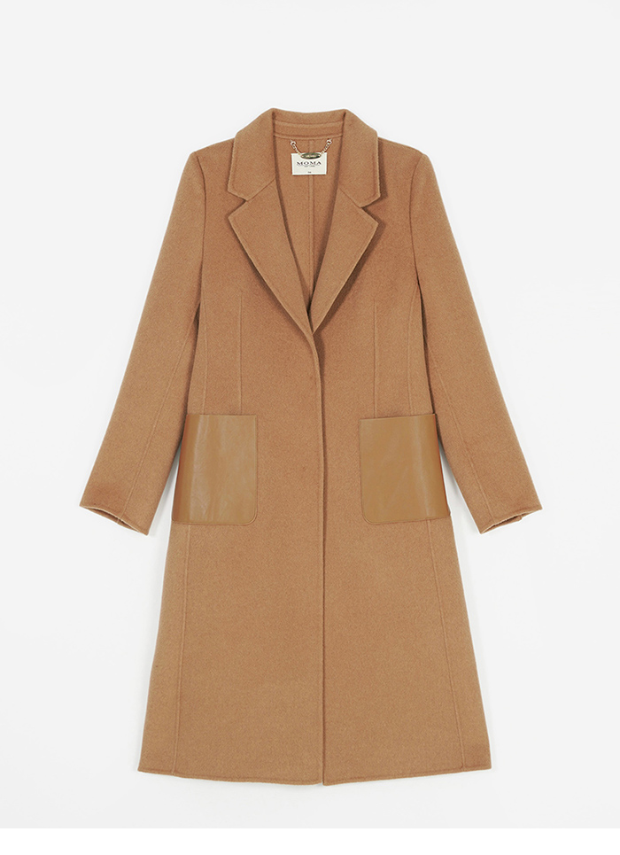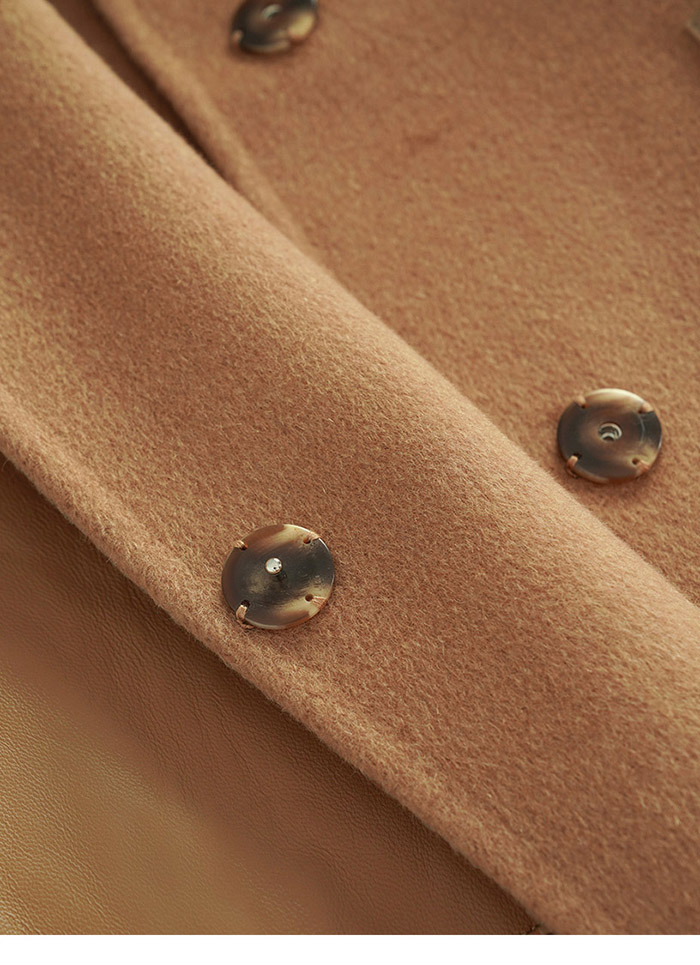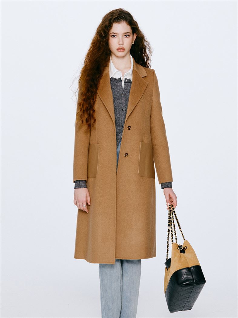 M+ | 韓系街頭拼接真皮羊毛率性大衣-咖啡