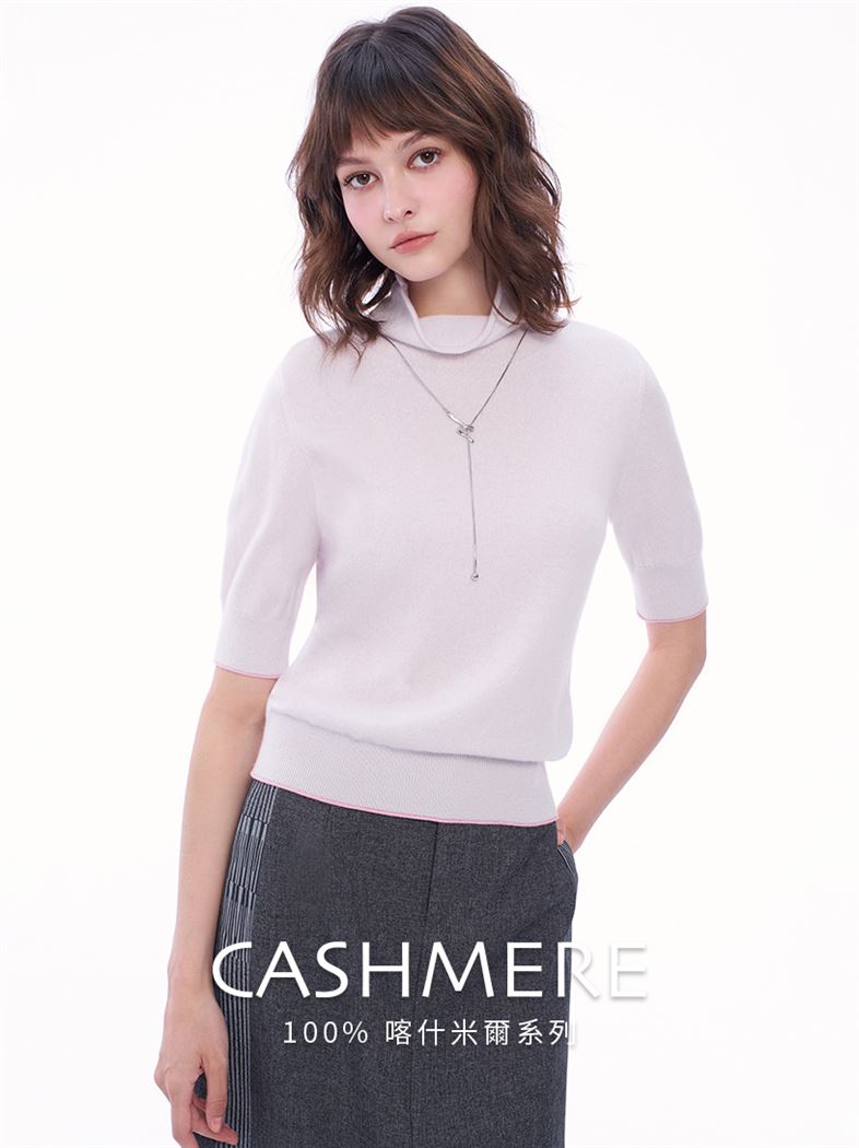 推薦同款粉色穿搭 M+ | 高領五分袖100%羊絨針織上衣-粉 請點我