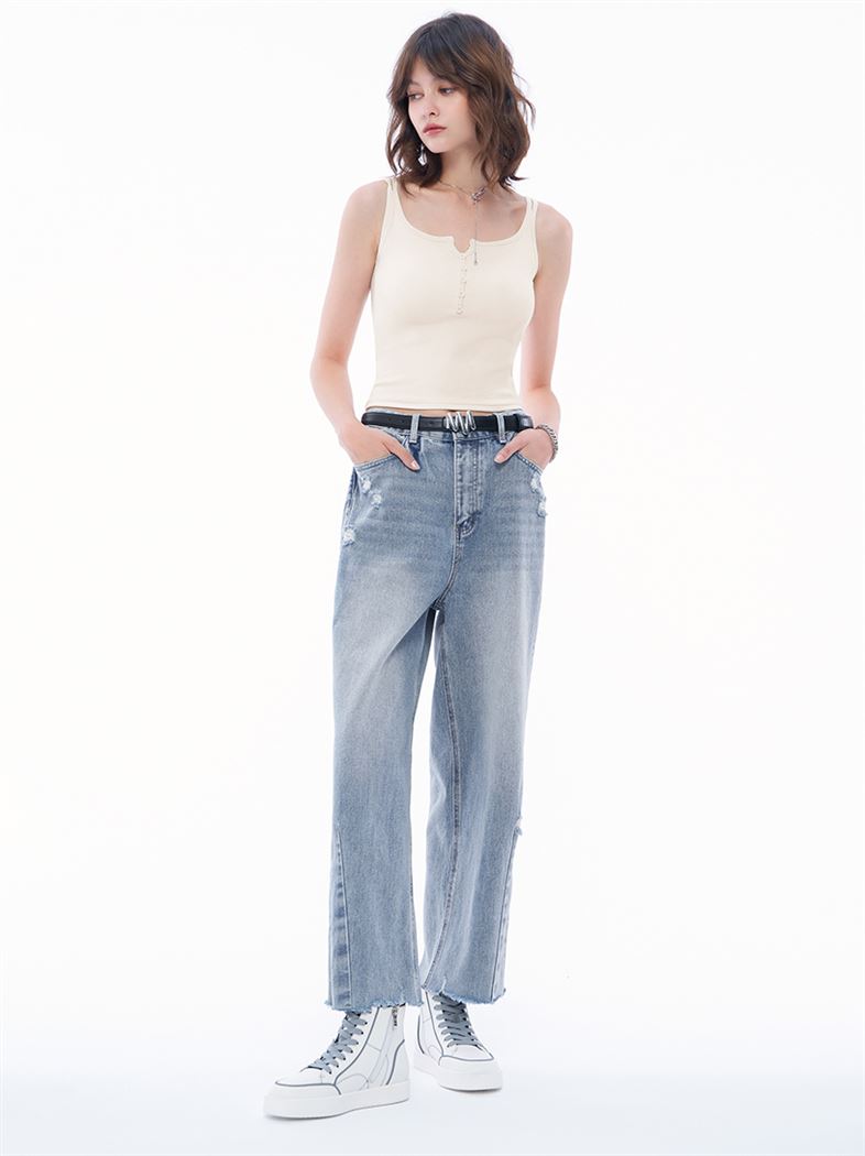 推薦穿搭 潮流刷破毛邊純棉牛仔繭形褲 請點我