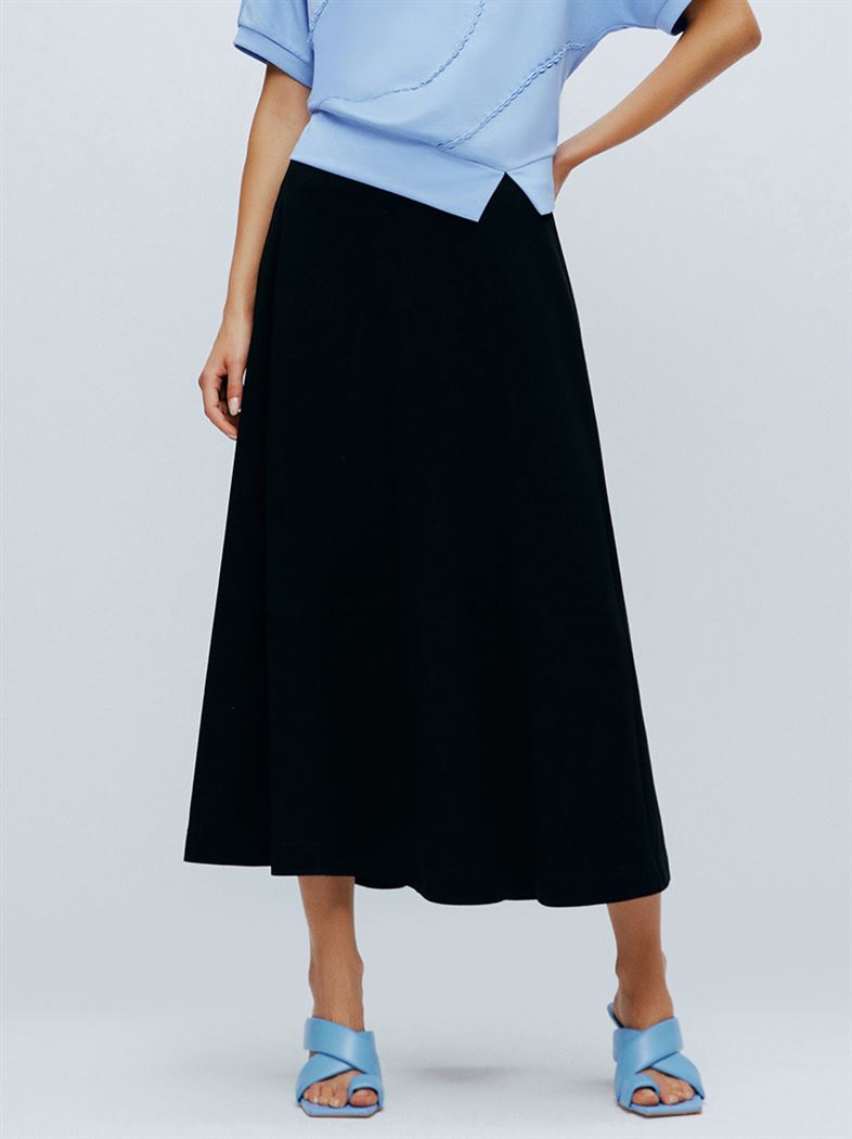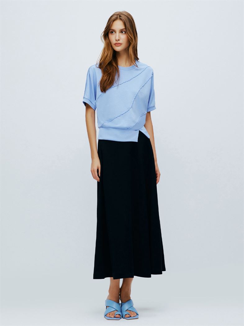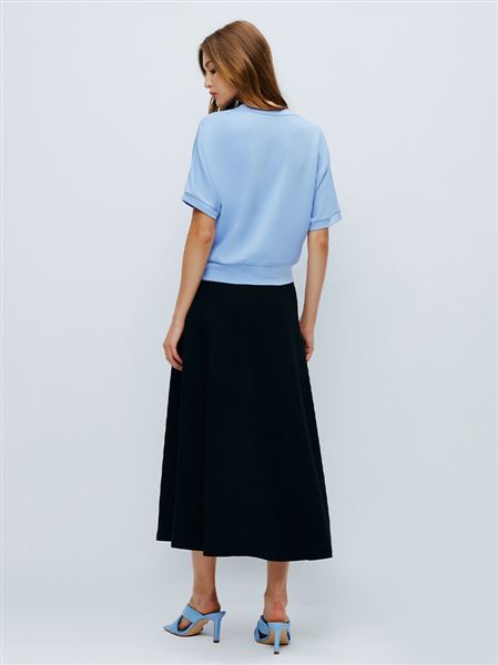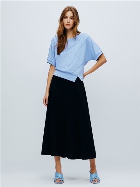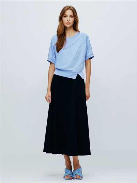 - 裙身腹部直縫線、裙襬衩片造型,垂墜飄曳度100%
