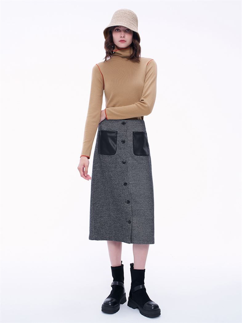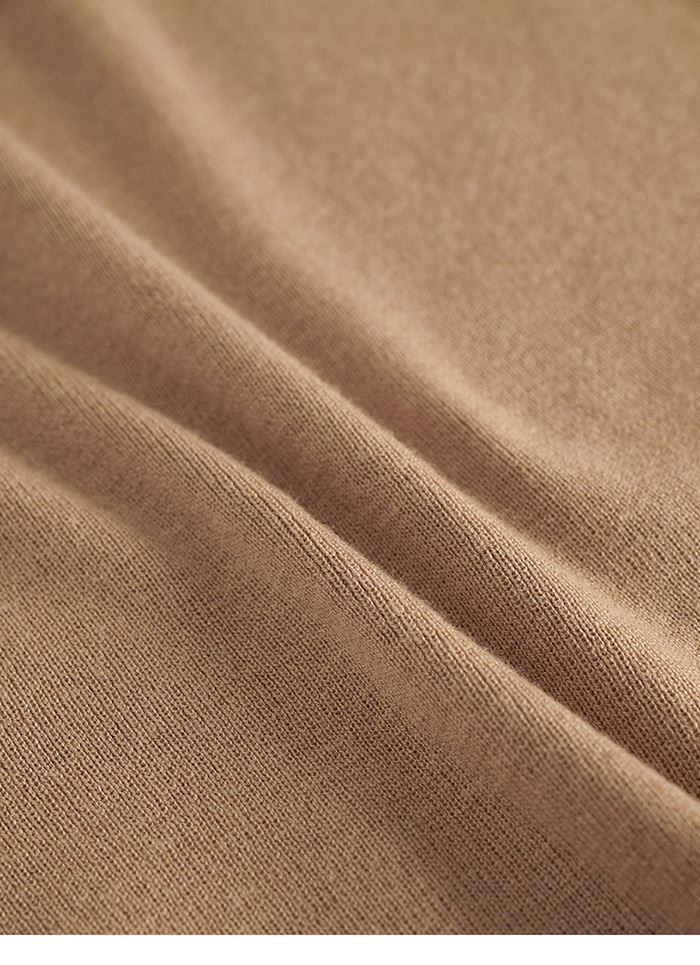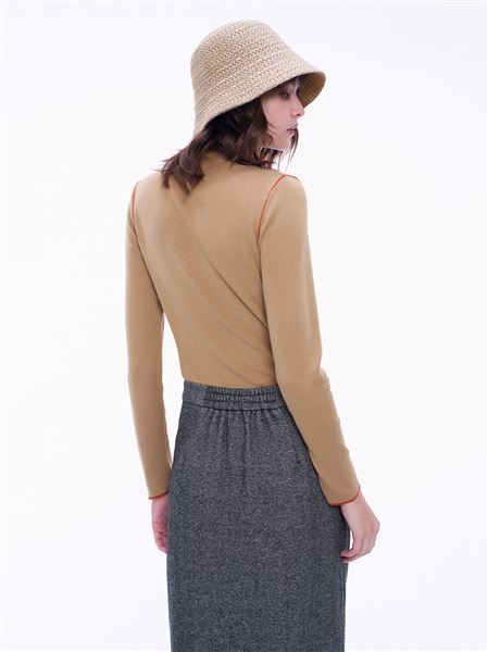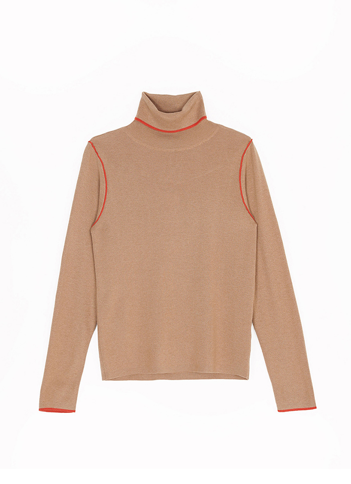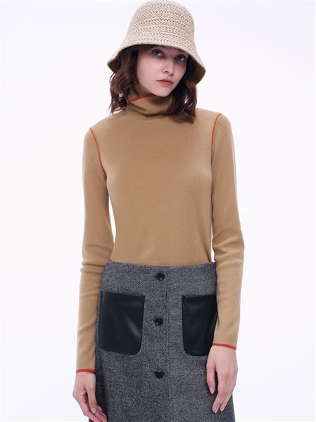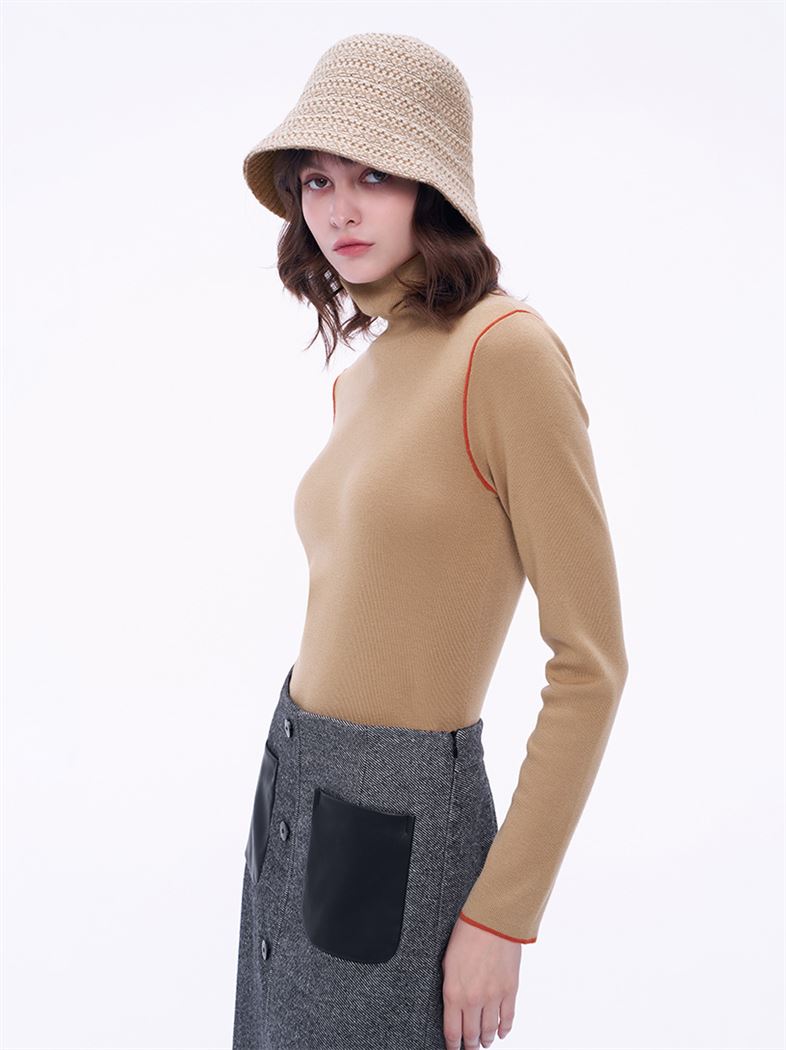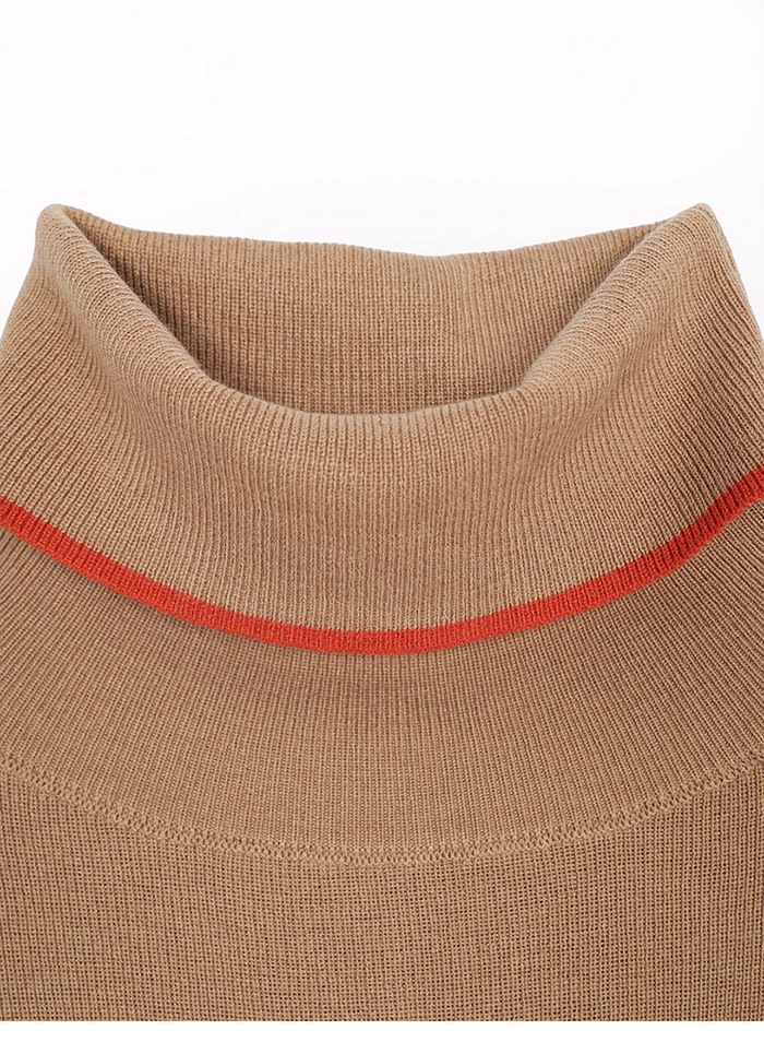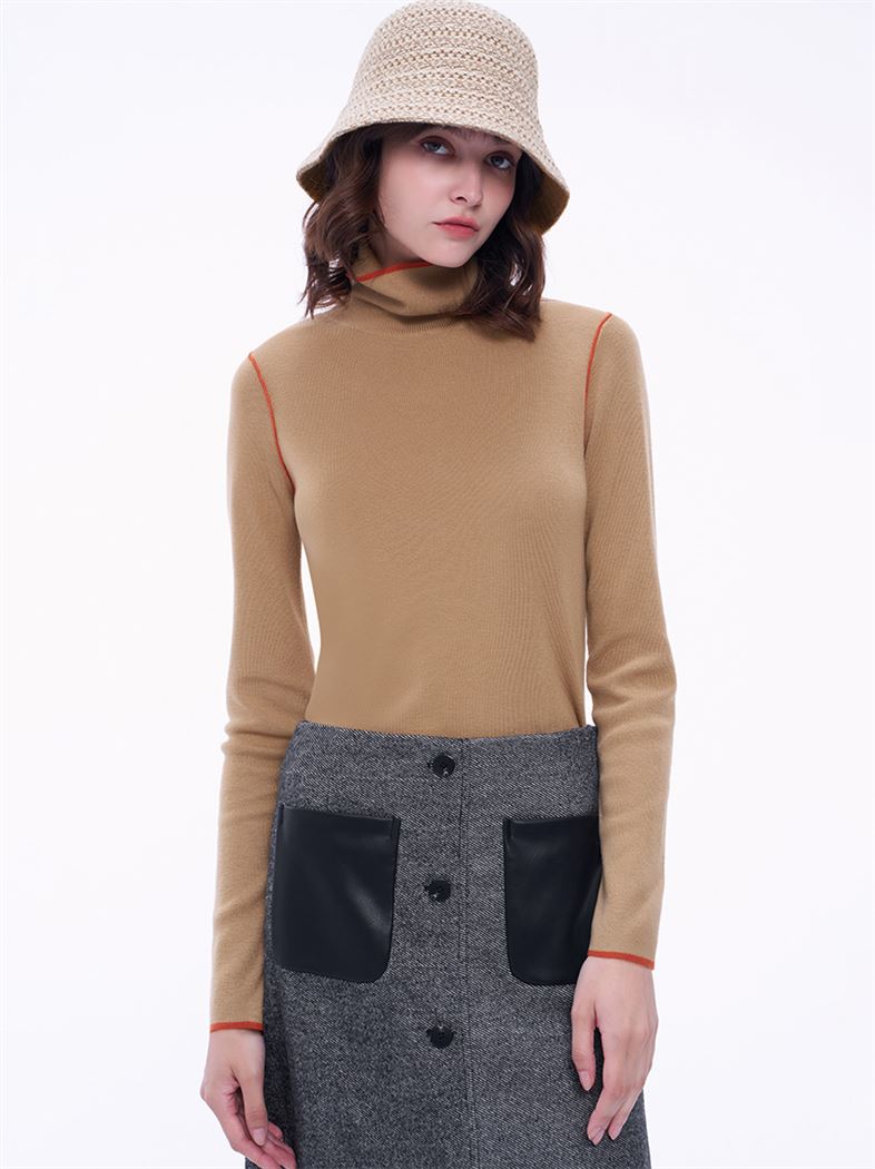 基礎撞色反褶高領羊毛針織上衣-卡其