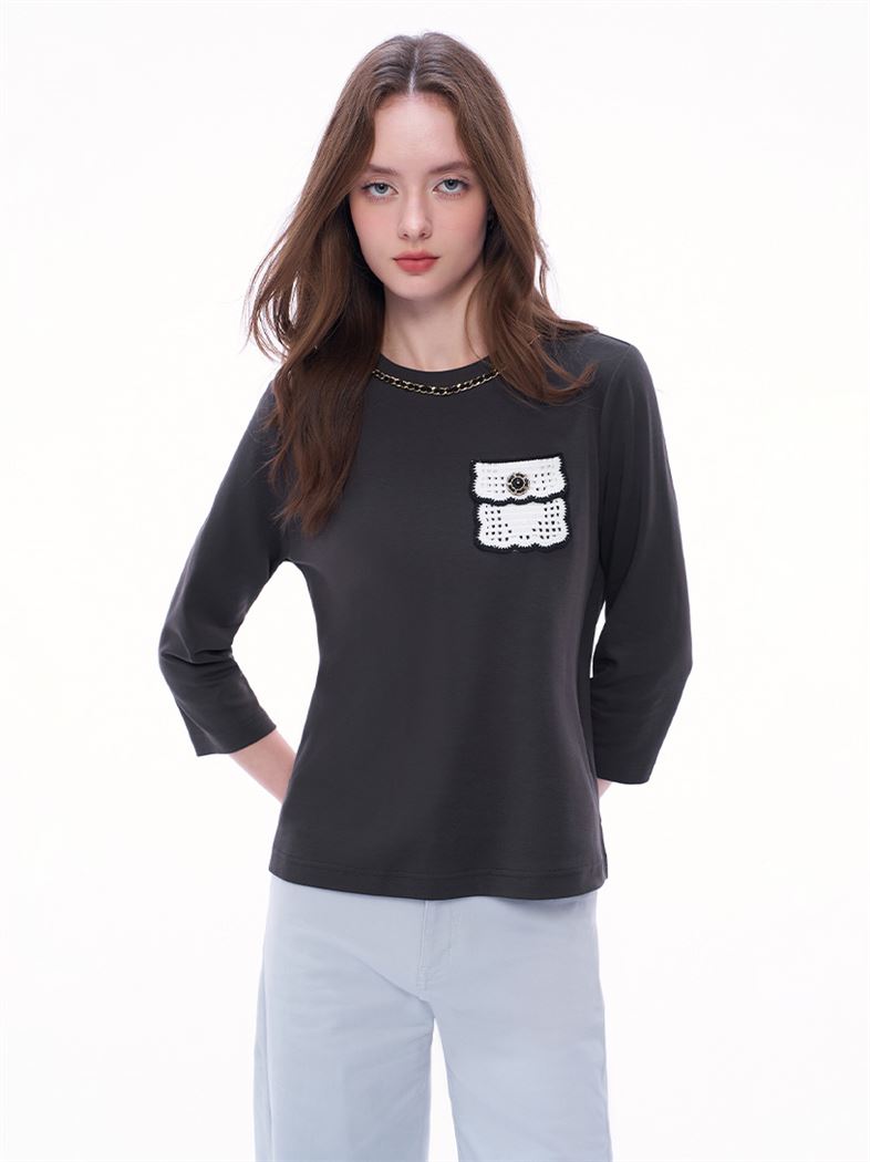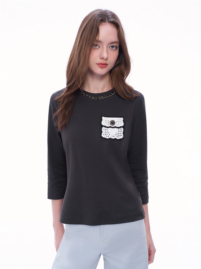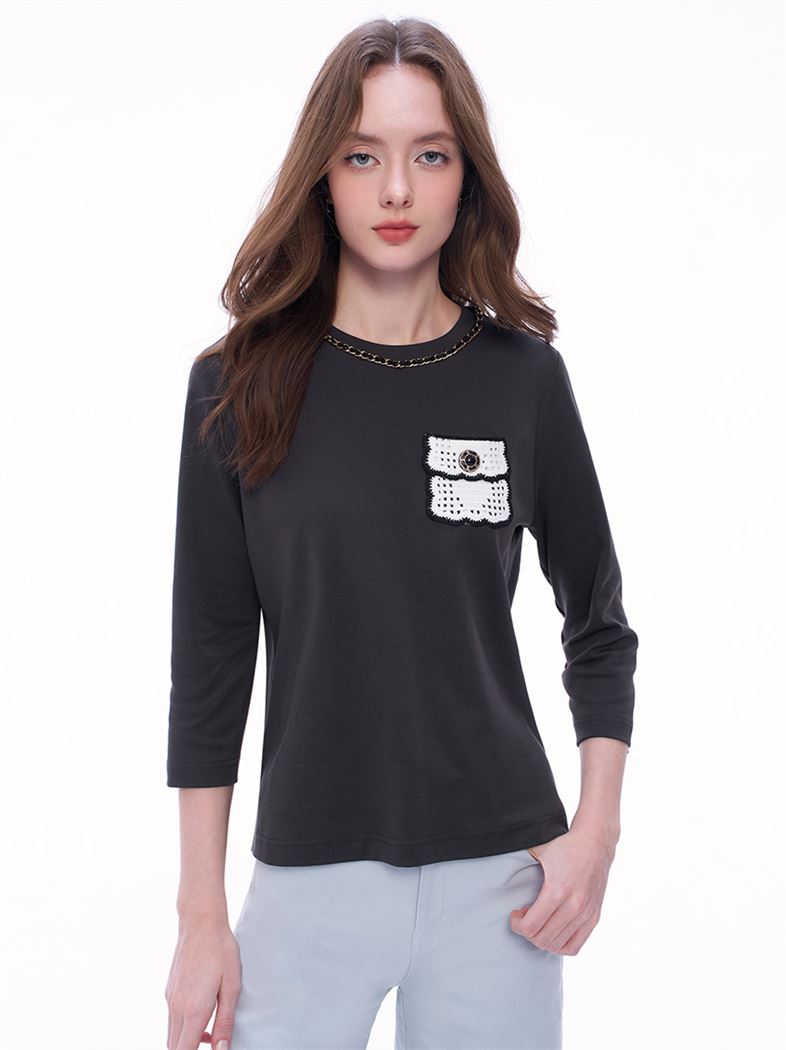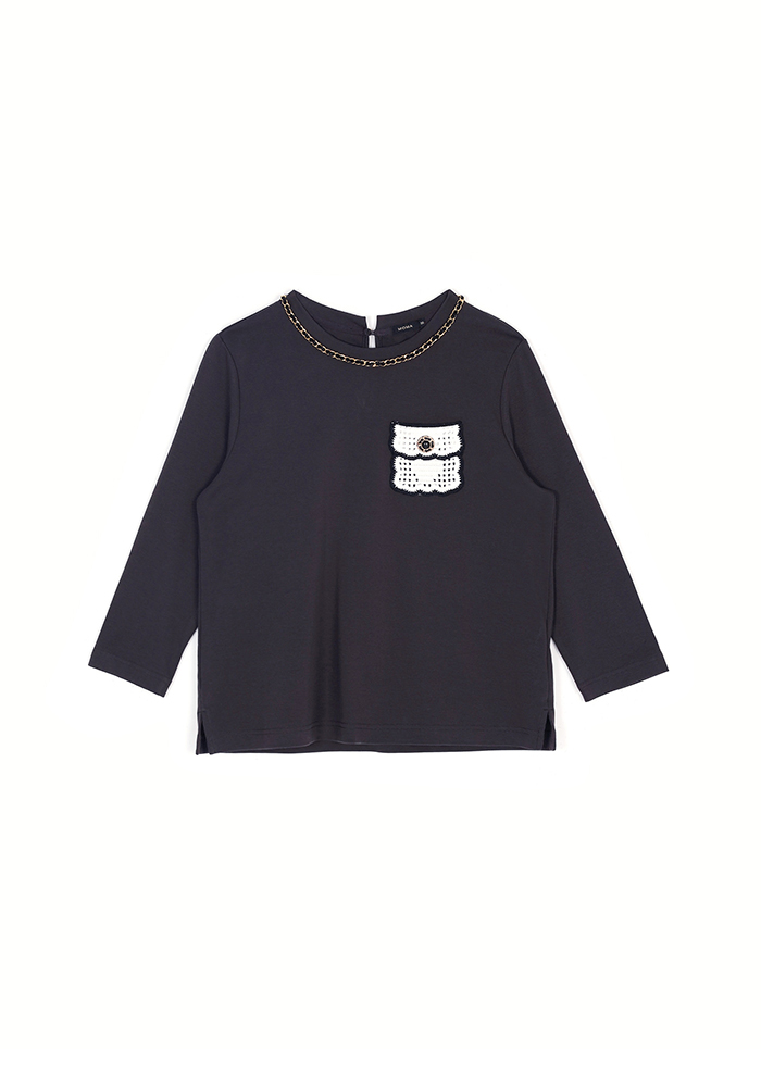 - 胸前單側撞色花邊編織玫瑰金邊釦口袋,精緻實用