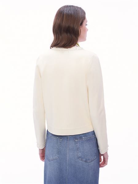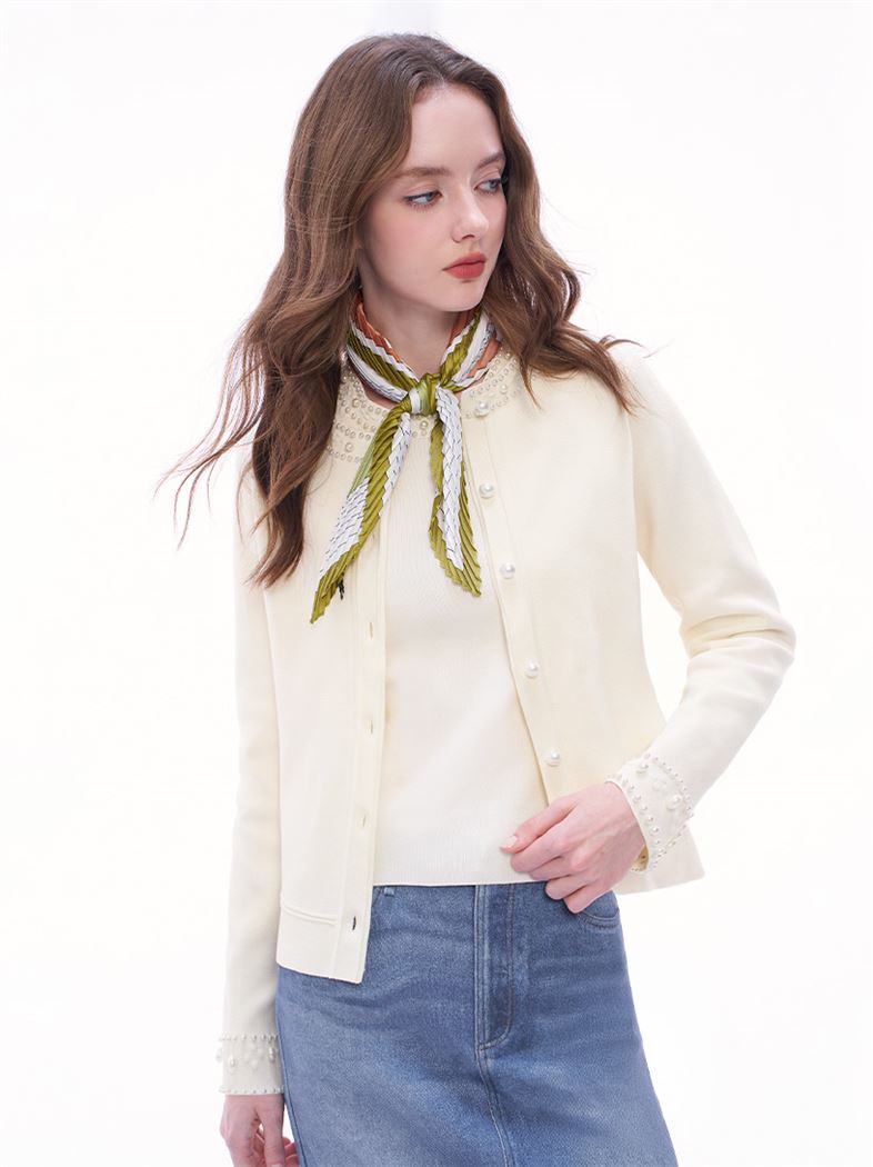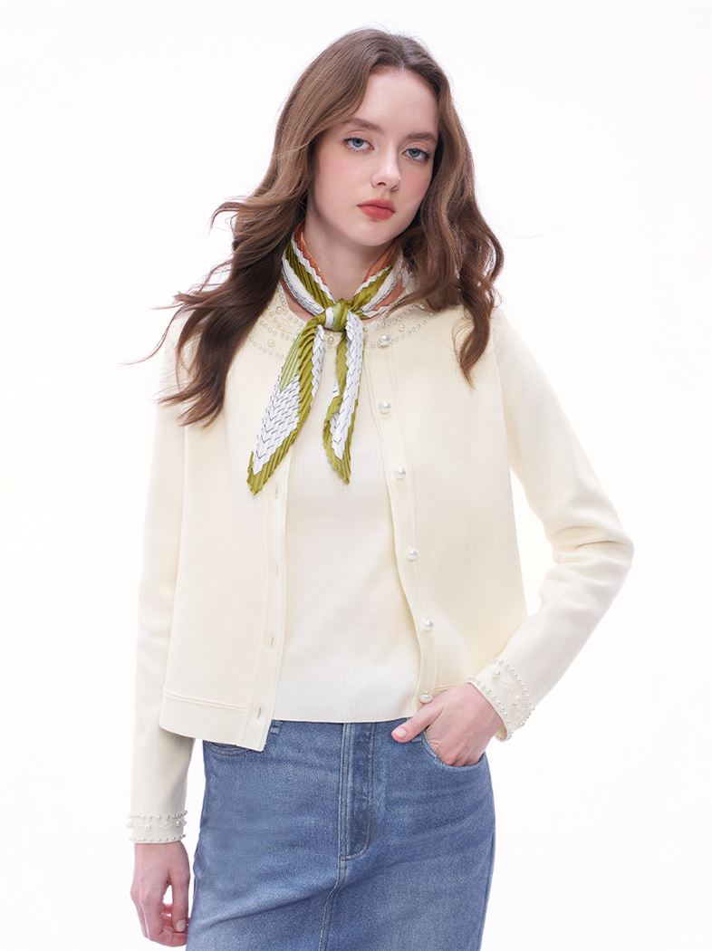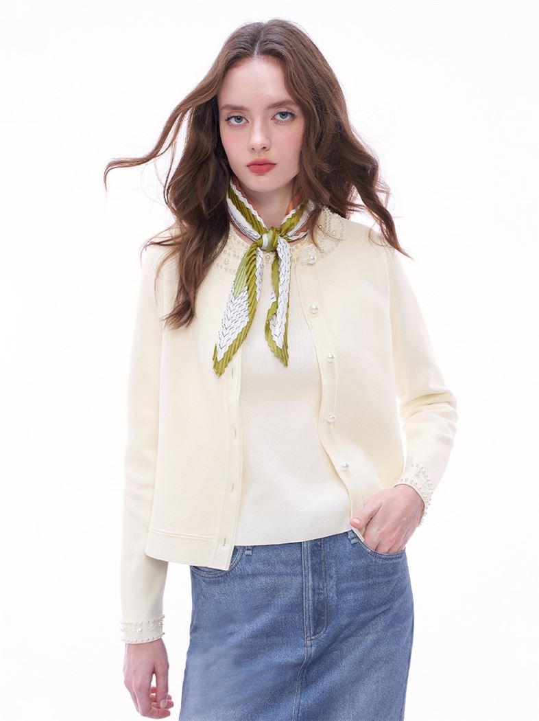 推薦同款粉色穿搭 輕奢貴氣珍珠滾邊針織外套-粉 請點我