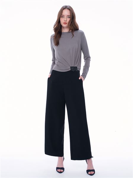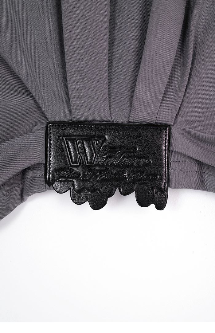 - 衣襬單側褶皺與不規則字母皮標,增添造型