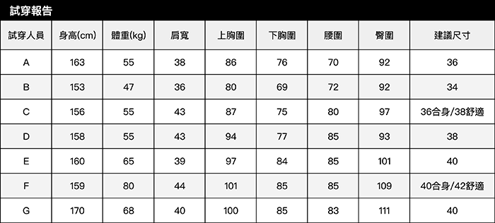 | 胸圍 | 86.4 cm | 91.4 cm | 94.6 cm | 97.2 cm | 34" | 36" | 37 1⁄4" | 38 1⁄4" |