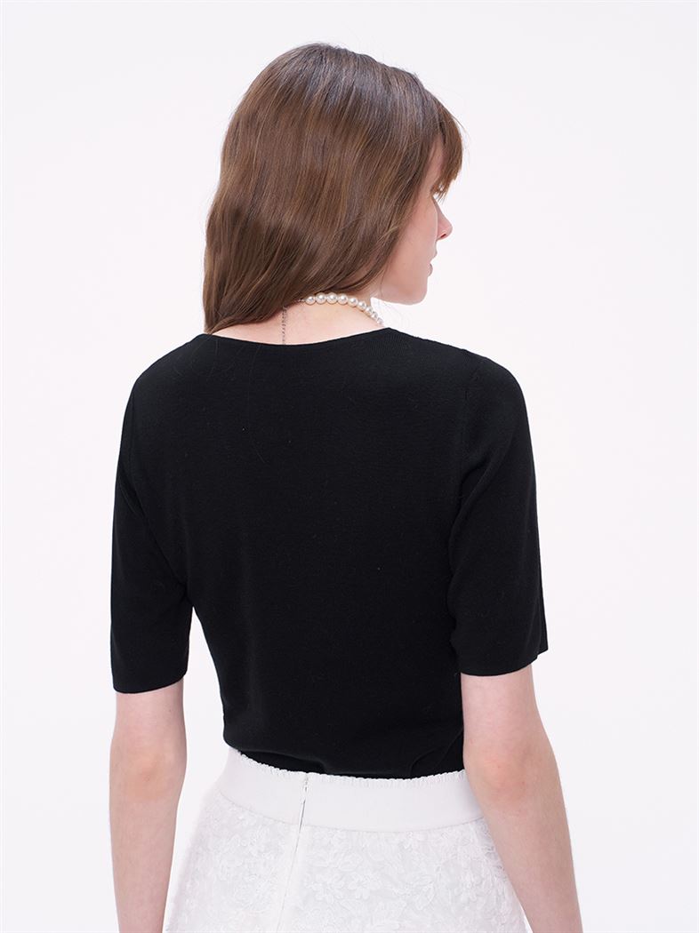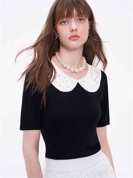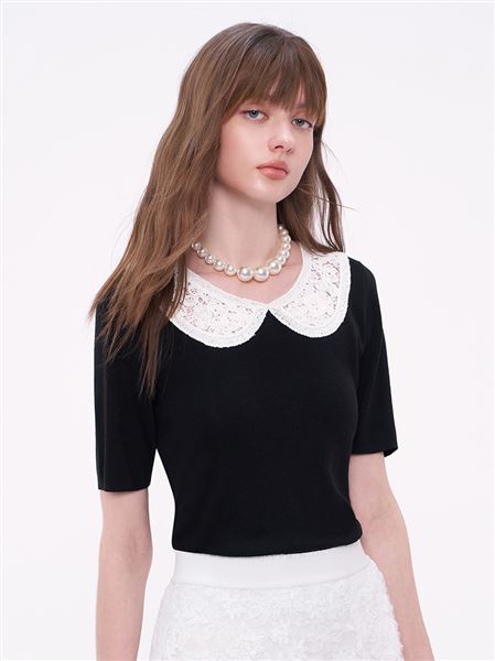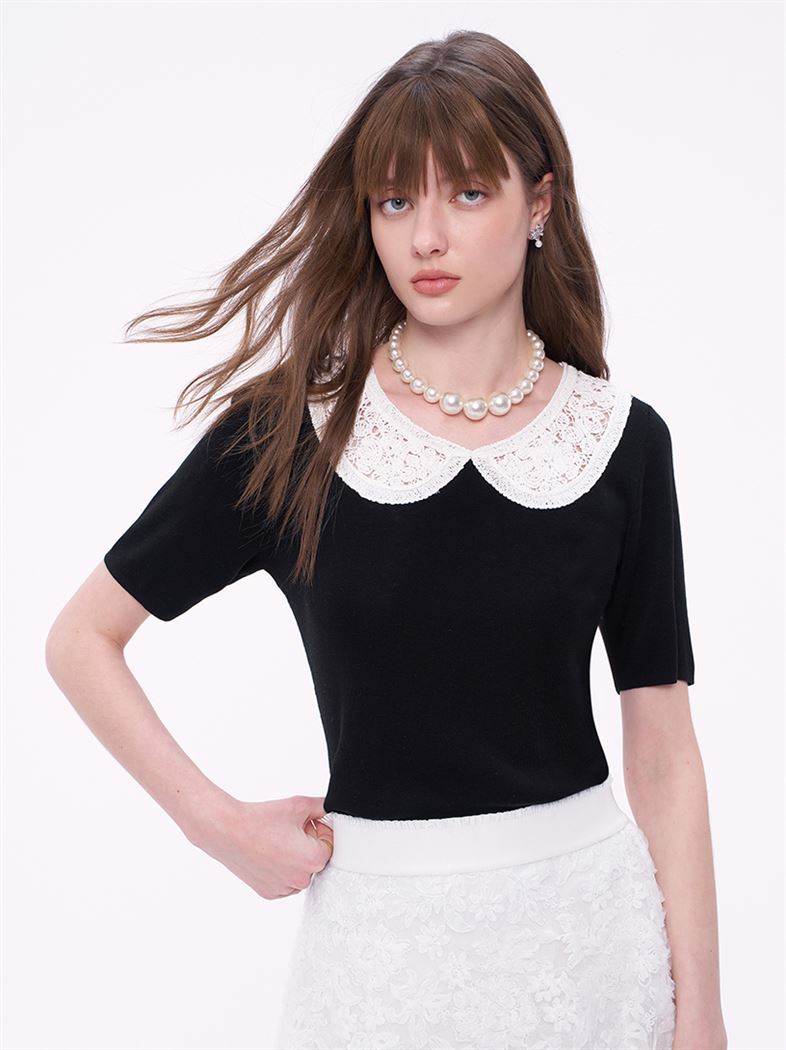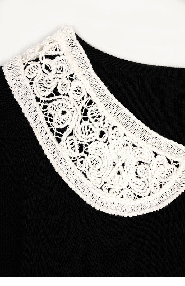 宮廷風鏤空蕾絲羊毛針織上衣-黑