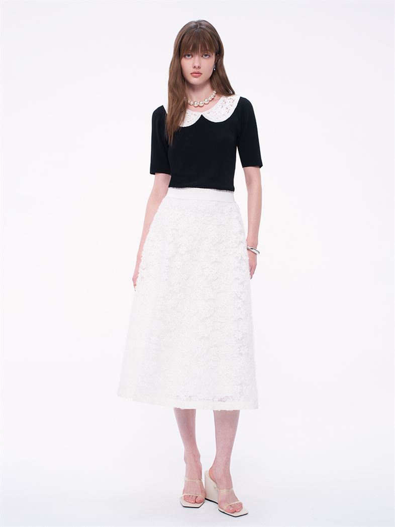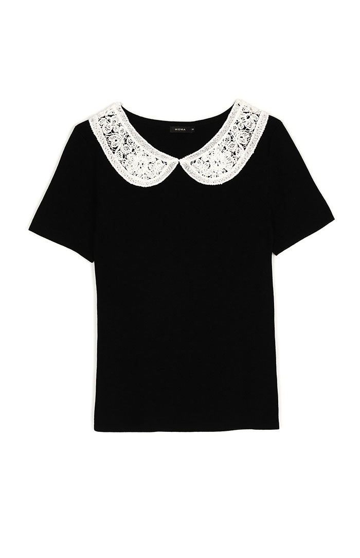 - 領口拼接鏤空手鉤蕾絲領片設計,精緻優美