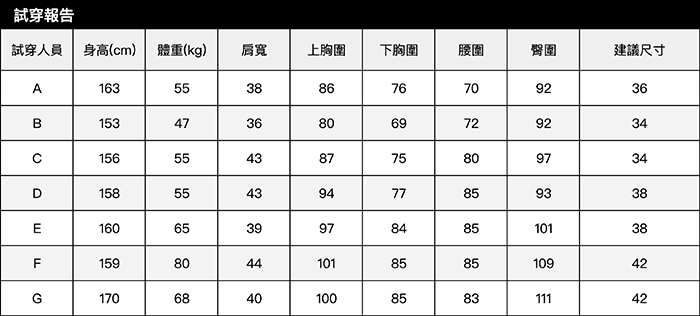 | 胸圍 | 94 cm | 100.3 cm | 104.1 cm | 110.5 cm | 114.3 cm | 37" | 39 1⁄2" | 41" | 43 1⁄2" | 45" |