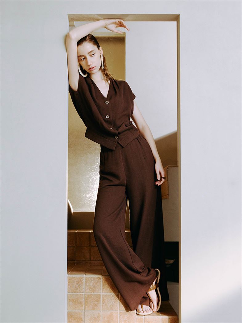 推薦成套穿搭 M+ | 簡約仿麻顯瘦零負擔蓋袖上衣-咖 請點我