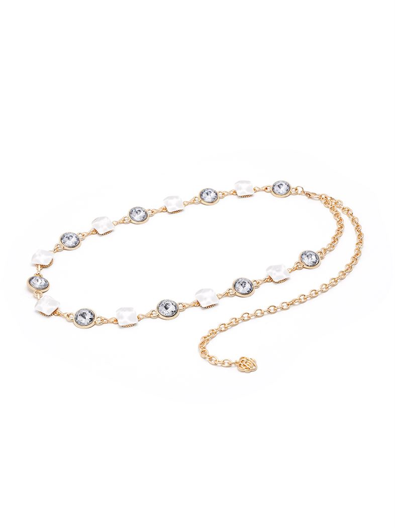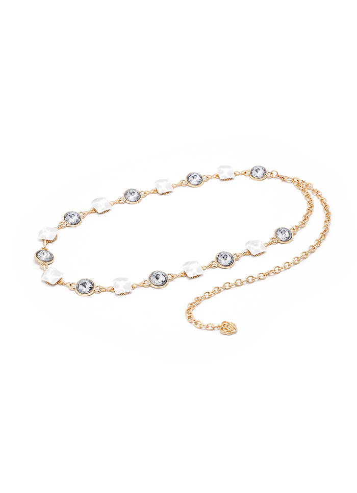 推薦同款淺紫色穿搭 夢幻彩色石光影粼粼腰鍊-淺紫 請點我