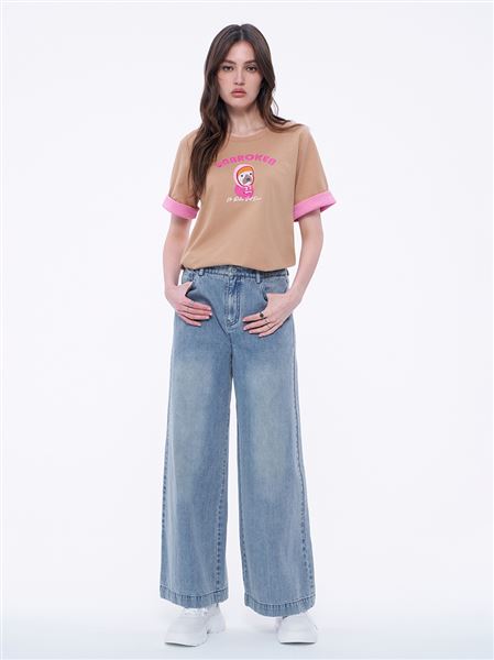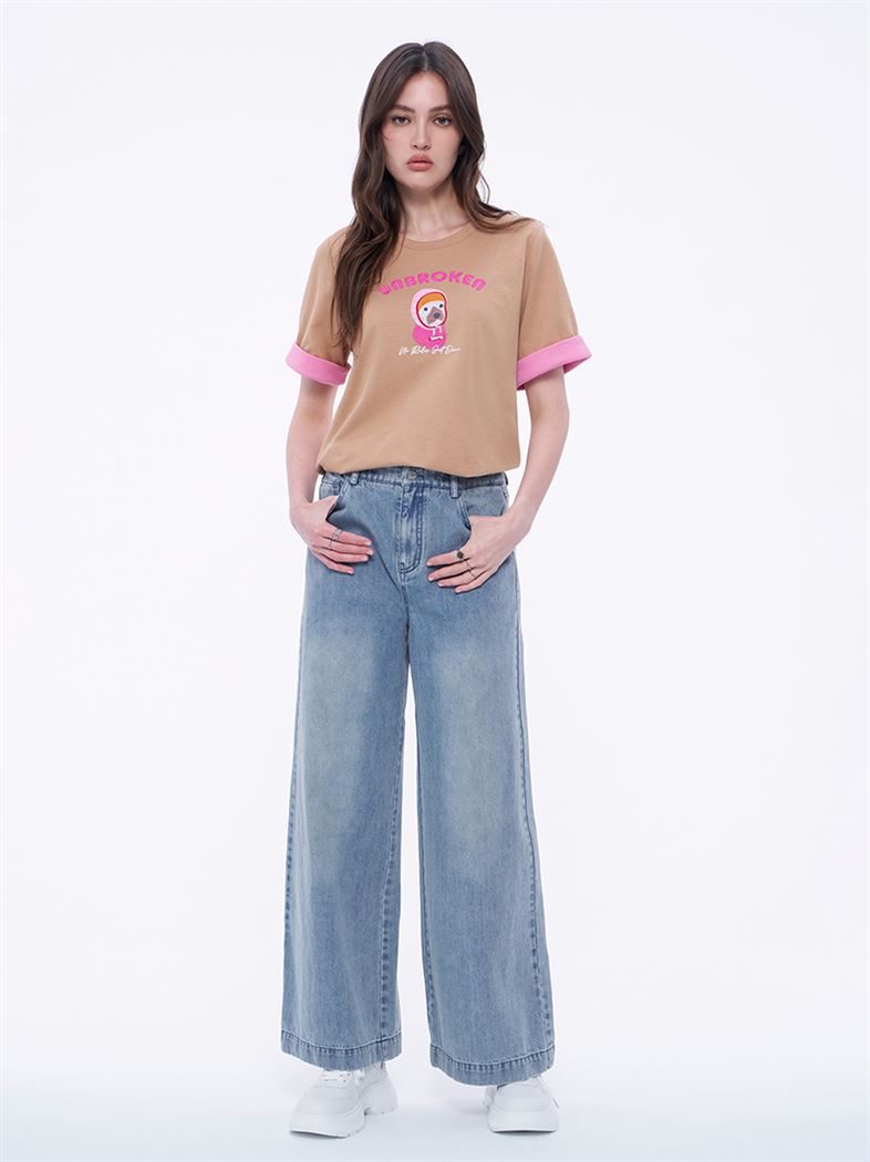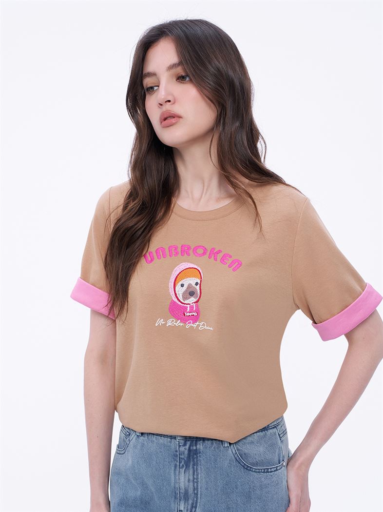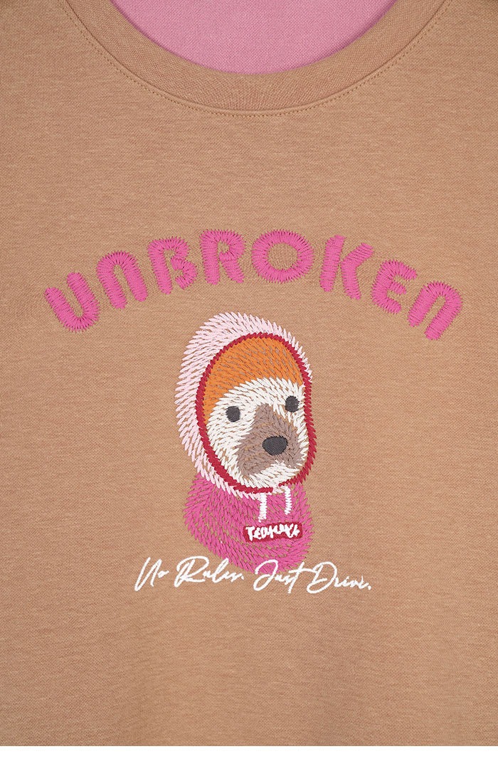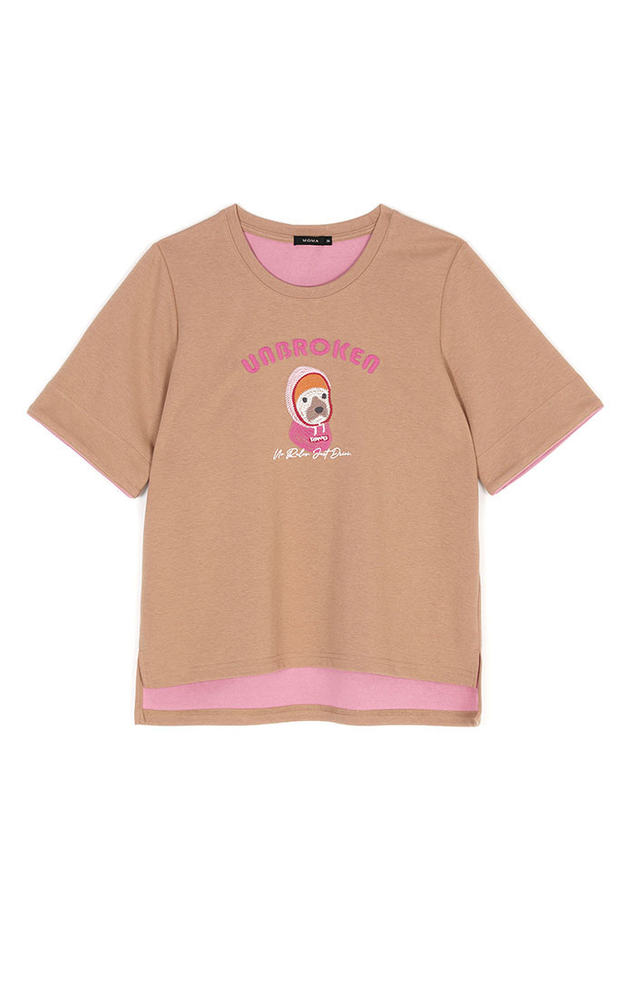 - 圓領與前片撞色字母刺繡及不倒翁狗狗設計