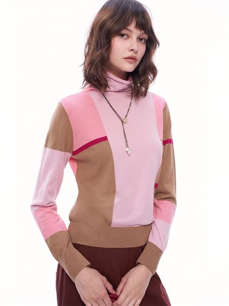 幾何跳色碰撞羊毛針織高領上衣-粉