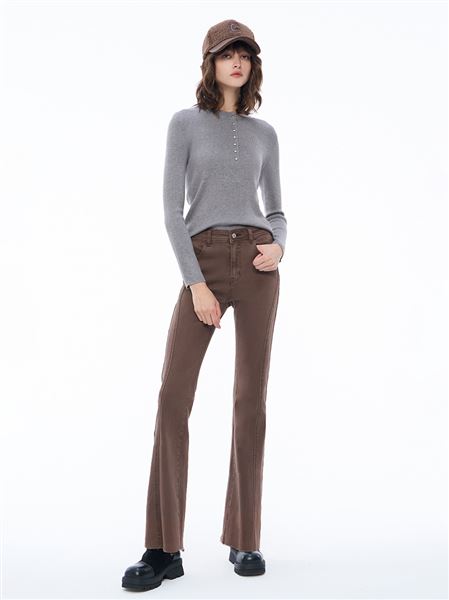 巧克力牛奶抽鬚不收邊內磨毛小喇叭褲