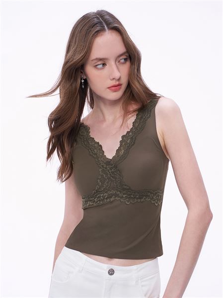 M+ | 性感蕾絲假兩件莫代爾上衣-咖