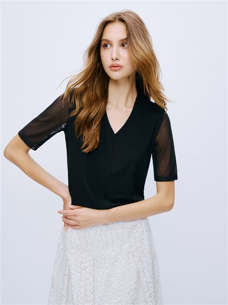 【官網獨賣】涼爽透肌感V領六角網布五分袖上衣-黑