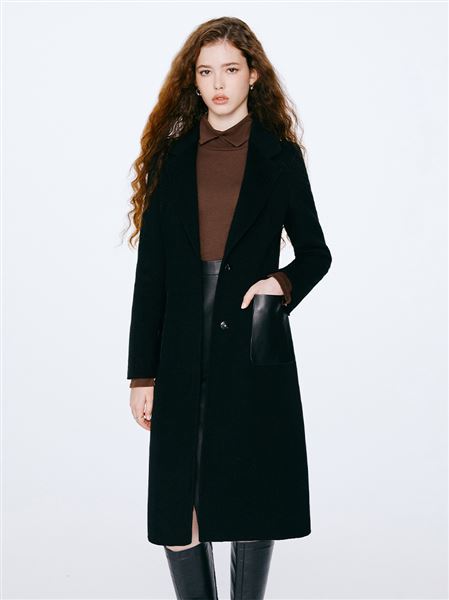 M+ | 韓系街頭拼接真皮羊毛率性大衣-黑