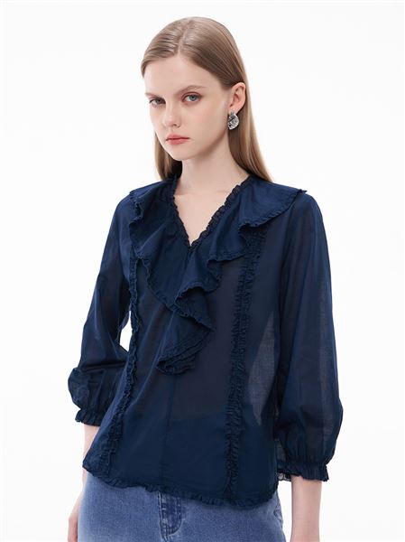 氣質立體荷葉邊純棉七分泡泡袖上衣