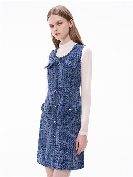 丹寧小香麻花紋編織玫瑰金線圈釦洋裝