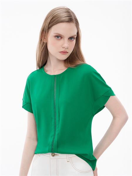 【官網獨賣】鏤空雕花花苞袖薄空氣棉上衣-綠