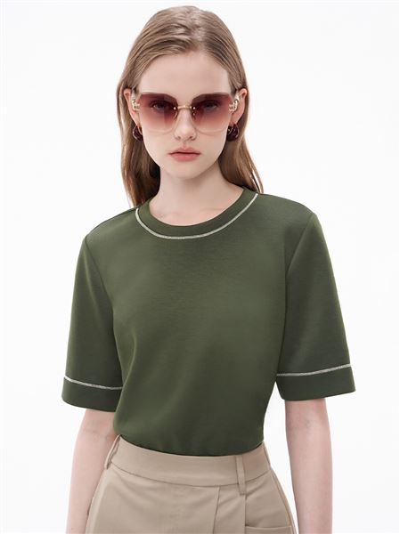 【官網獨賣】簡約銀珠描邊圓領太空棉上衣-深綠