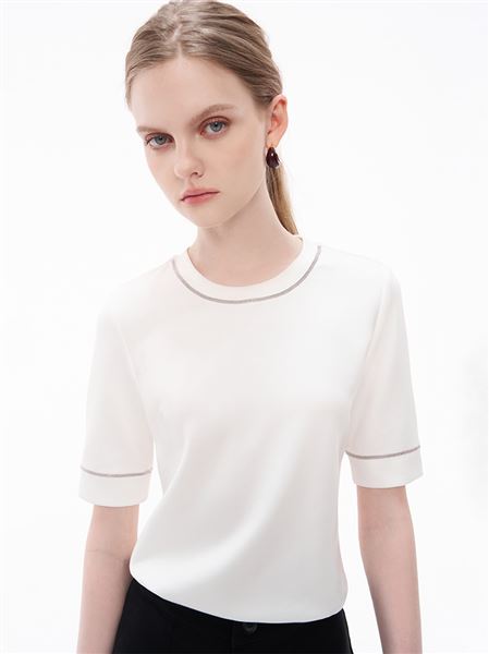 【官網獨賣】簡約銀珠描邊圓領太空棉上衣-白