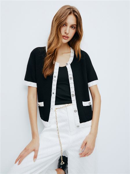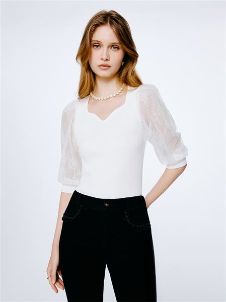【官網獨賣】甜美少女鈎織花邊領五分泡泡袖針織上衣-黑