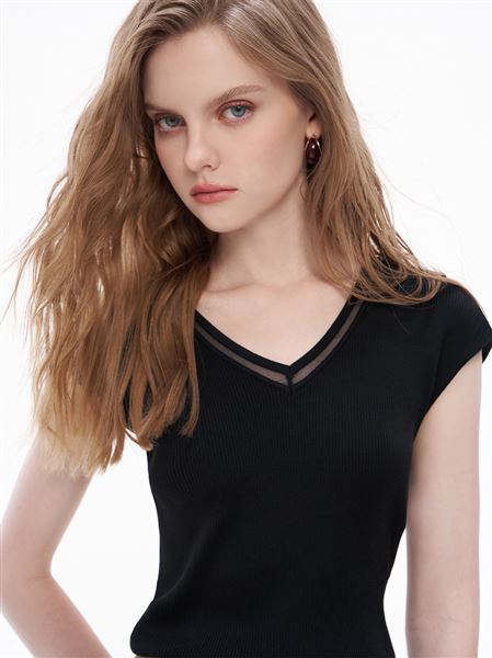 【官網獨賣】涼爽透膚織帶V領小蓋袖冰爽絲上衣-黑